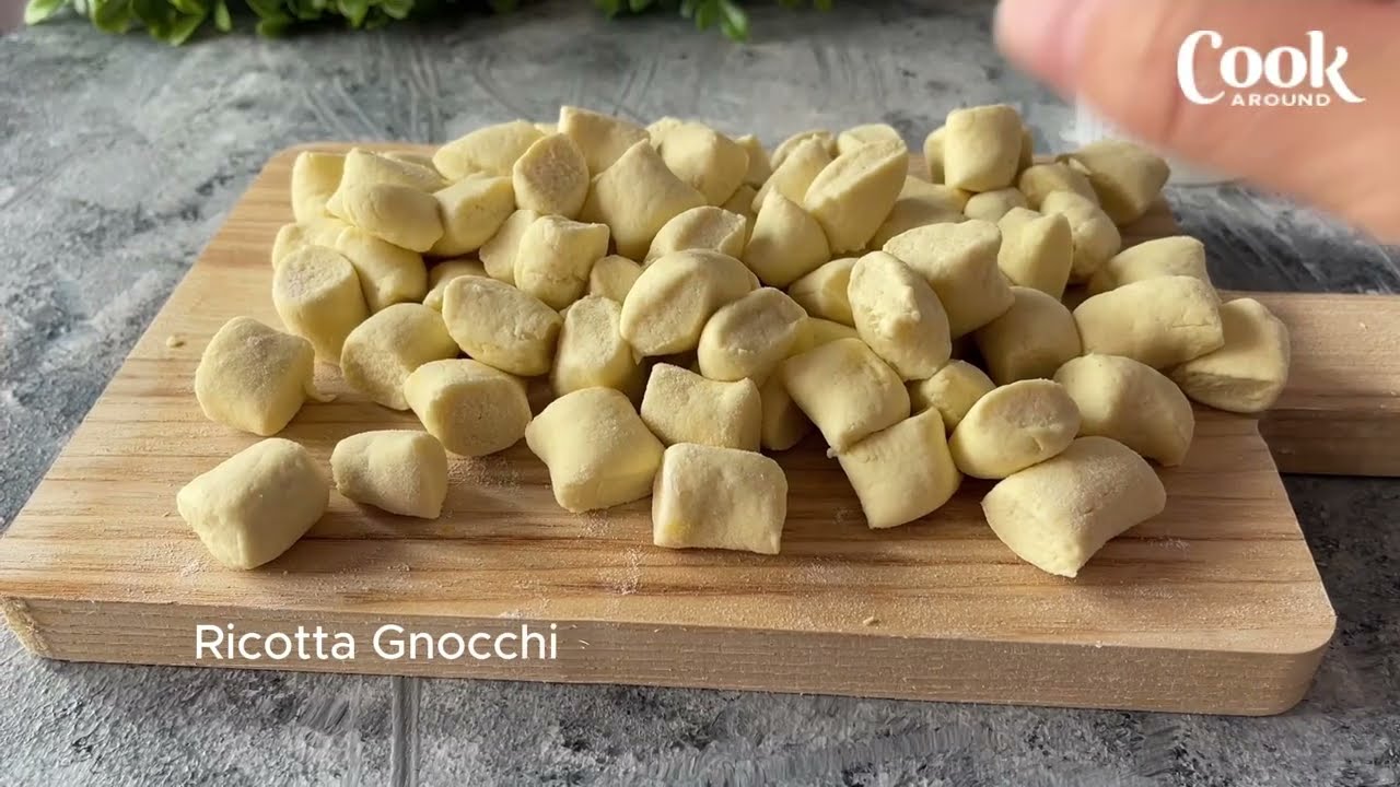Ricota Noki is an easy and quick Italian recipe made with just three ingredients let’s make it put drained and well dried Rota and egg yolk in a large bowl and start mixing them together gradually add the flour with a pinch of salt and work the dough with your Hands shape it into a small ball then let it rest for a few minutes divide the dough into several portions sprinkle some flour on the work surface and roll each portion into a small Loaf once each Stow loaf has the desired thickness cut it into small pieces with a sharp Knife once all Noki are formed plunge them into boiling salted water they’re ready when they rise to the surface enjoy your meal and keep cooking with cook around