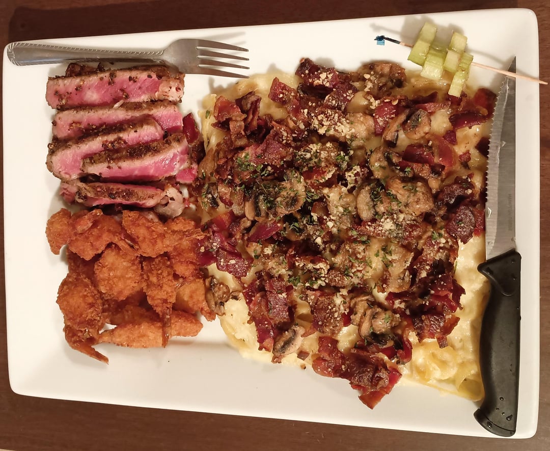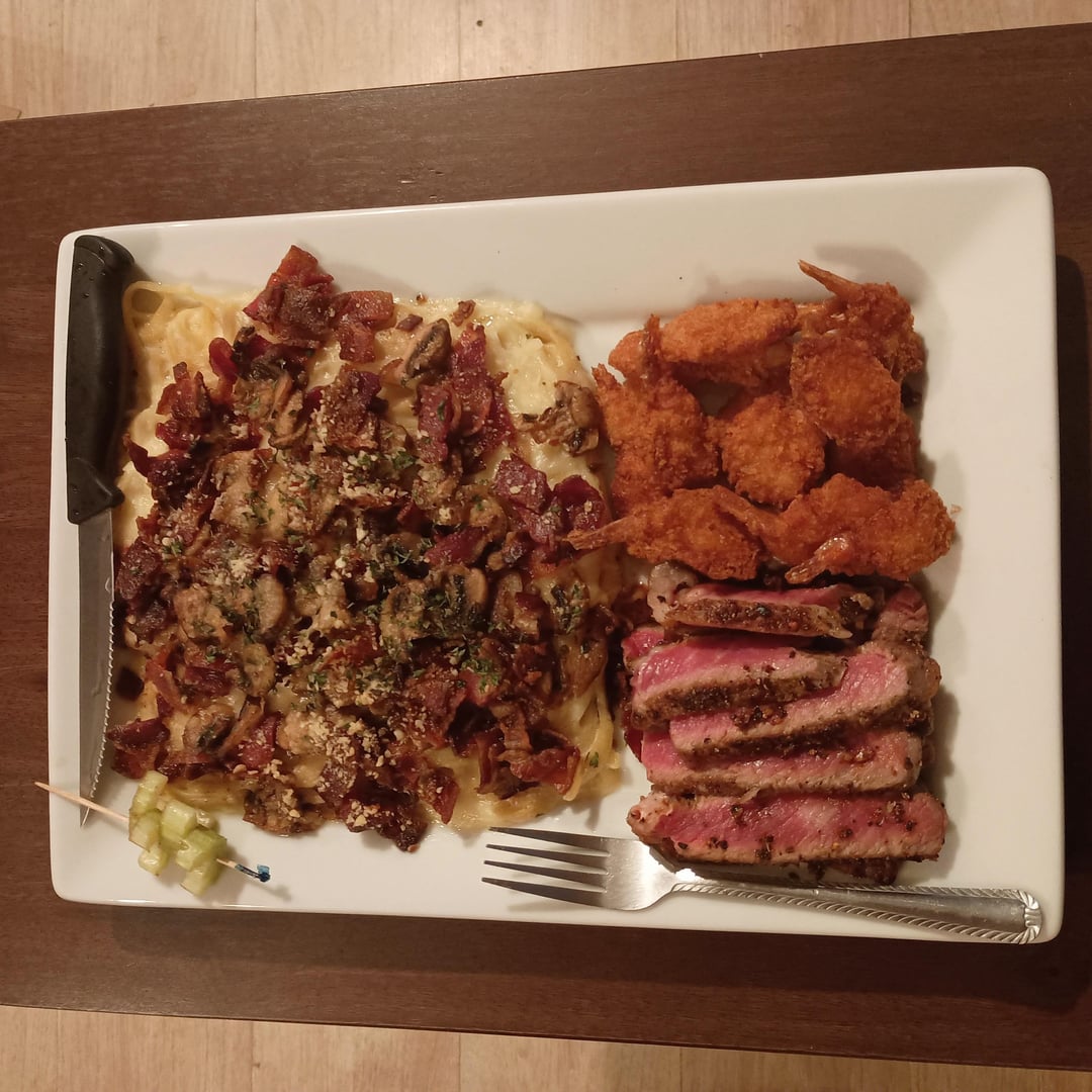 Mushroom and Bacon Fettuccine Alfredo, Steak and Shrimp. by Comrade_Shaggy Homemade DishPastaWrite A CommentYou must be logged in to post a comment.