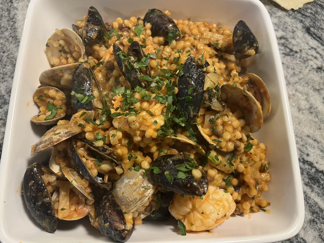 Fregola is a pasta typical of the region that is made by slowly building up layers of semolina flour with tiny amounts of water. In this dish I combined shellfish broth and passata to cook the Fregola with fennel, mussels, clams, and shrimp.
