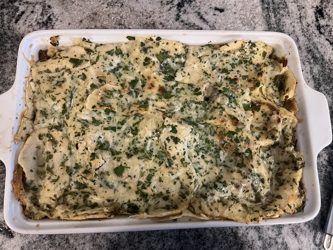Zuppa Gallurese is a traditional Sardinian dish made with pane spianata (a regional flat bread made with semolina flour), a blend of cheeses (in this case pecorino, Fiore Sardo, and caciocavallo) and parsley, then soaked in a lamb or goat broth.