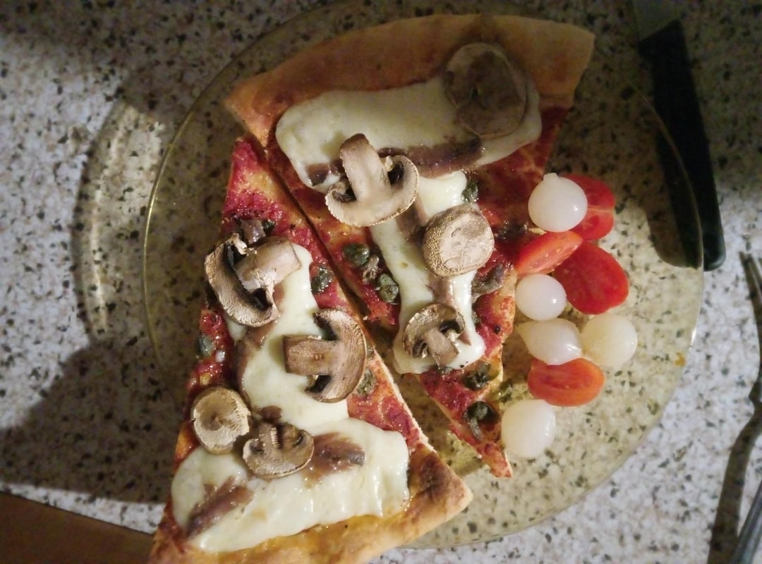 But in the fridge I had some Provolone piccante, champignon mushrooms and a jar of alici. (I feel slightly guilty, I got most if not all of those from Conad).