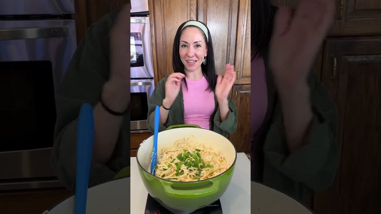 Together all right as you can see it has cooked up the cheese has melted down it is looking great creamy deliciousness m we have one pound of Linguini this is pre-cooked Linguini we’re just going to give this a stir and get all of our noodles covered with our creamy creamy