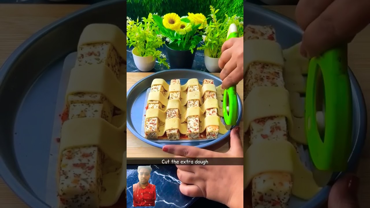 को रख दिया अब हमने इस पे हब पनीर के पीस को रख दिया और ये स्ट्रिप्स का ऊपर नीचे करके ऐसे अरेंज कर लिया अब हमने इस पे रखे और पनीर के पीसेज और ये सेम प्रोसेस फॉलो करके पिज्जा डो स्ट्रिप्स को ऐसे अरेंज कर