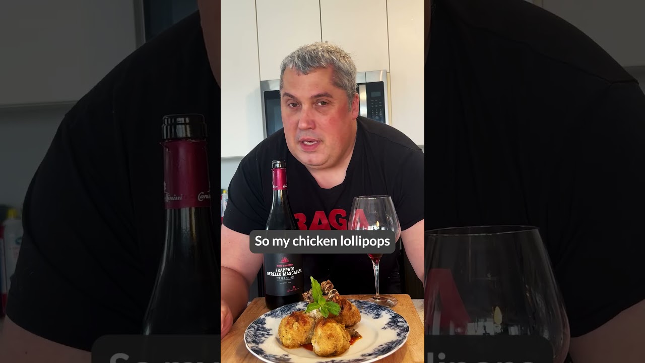This is going period of Time So my chicken lollipops are out of the oven I’ve got a nice fresh homemade tomato sauce a little sauteed oyster mushrooms as for the wine pairing going to Italy going to Sicily and going light and Fresh and Easy I’m going for a blend of frado and Nella mascaly cheers