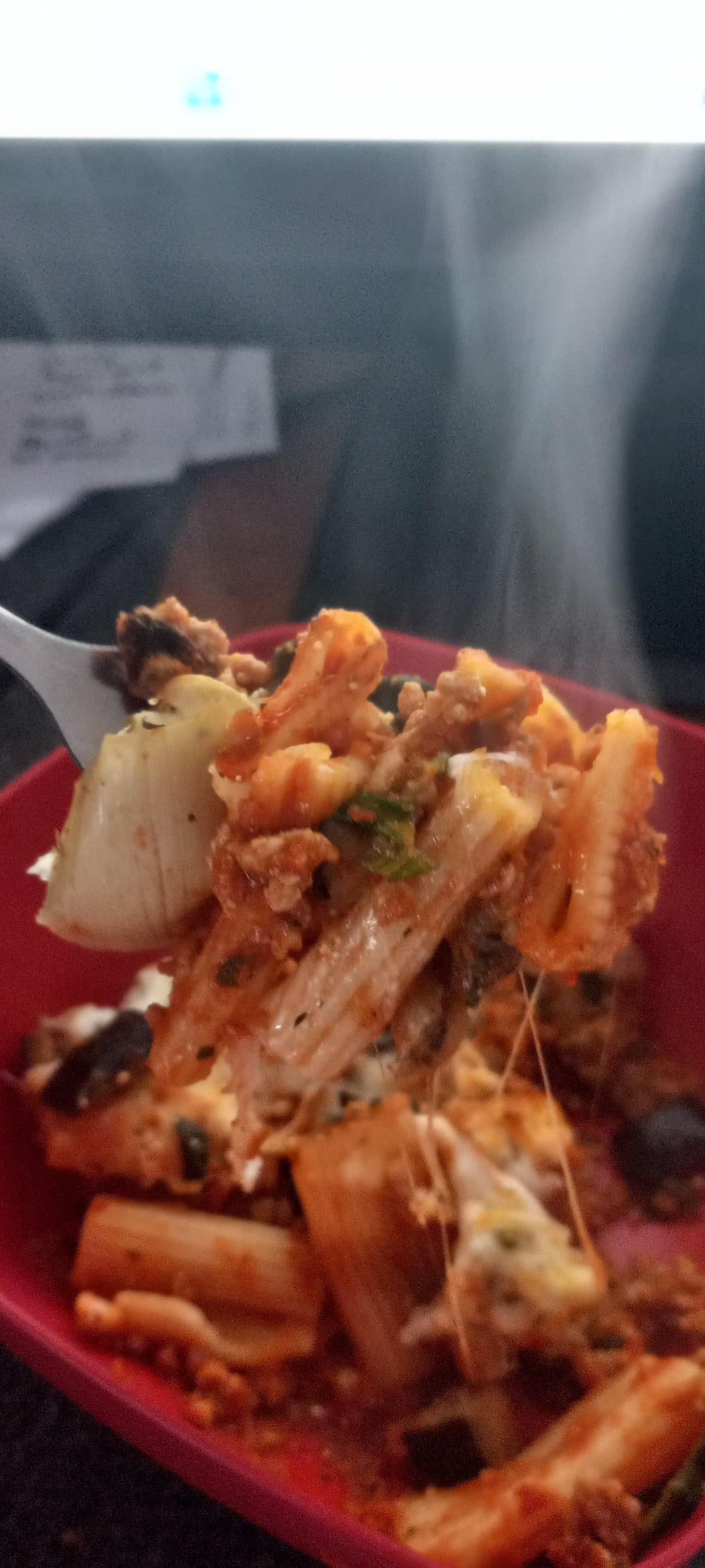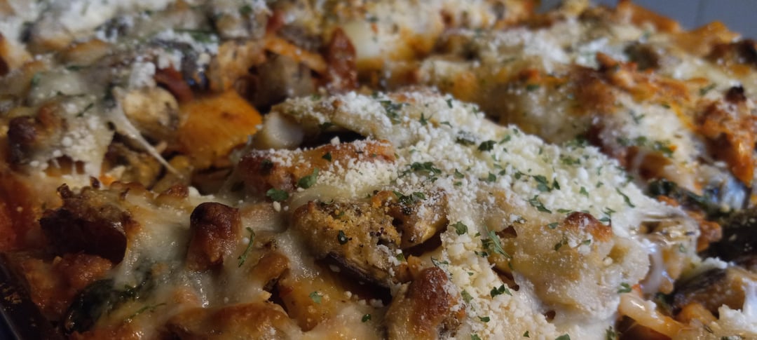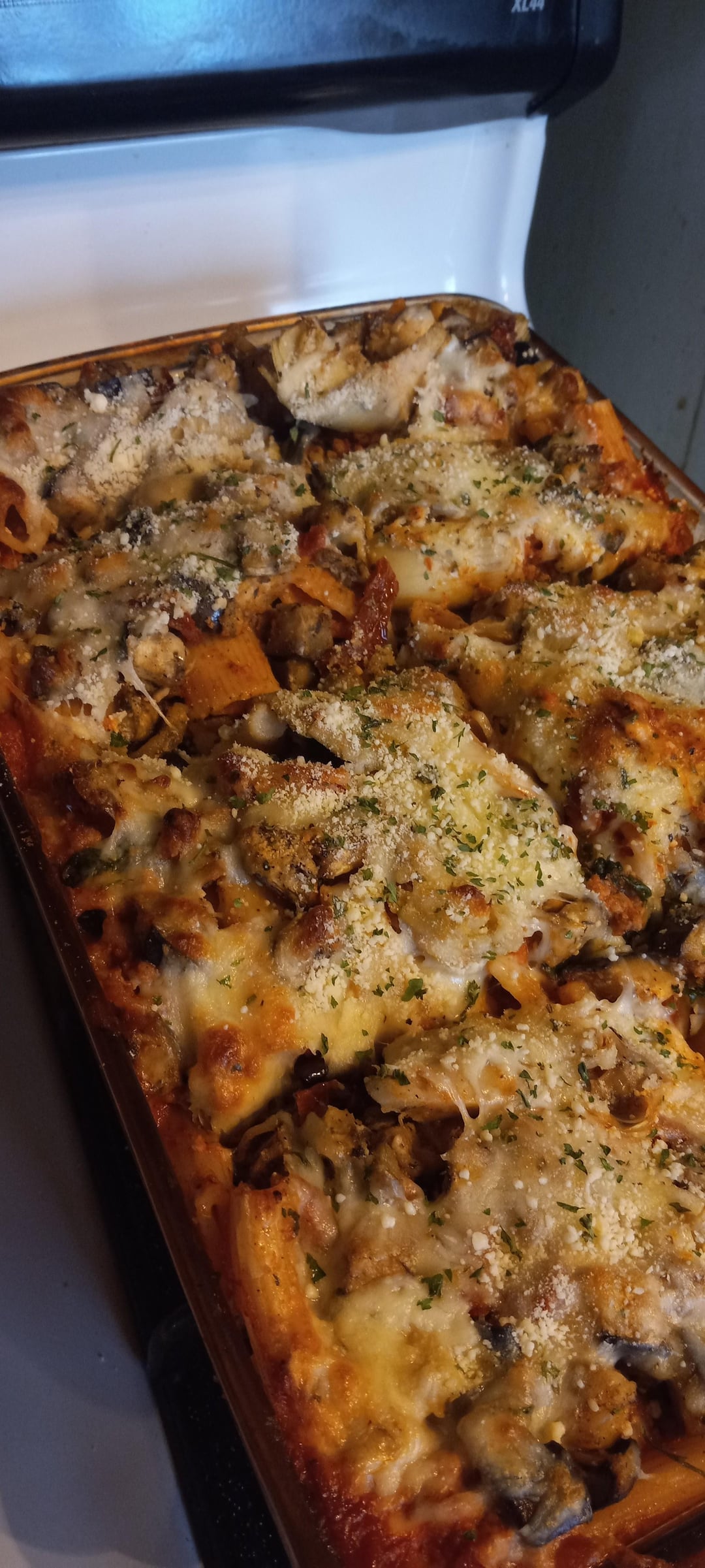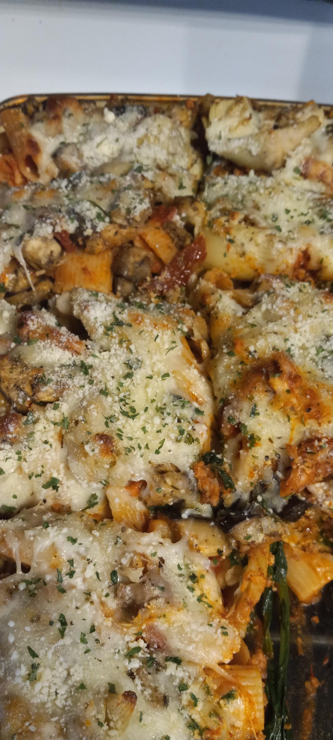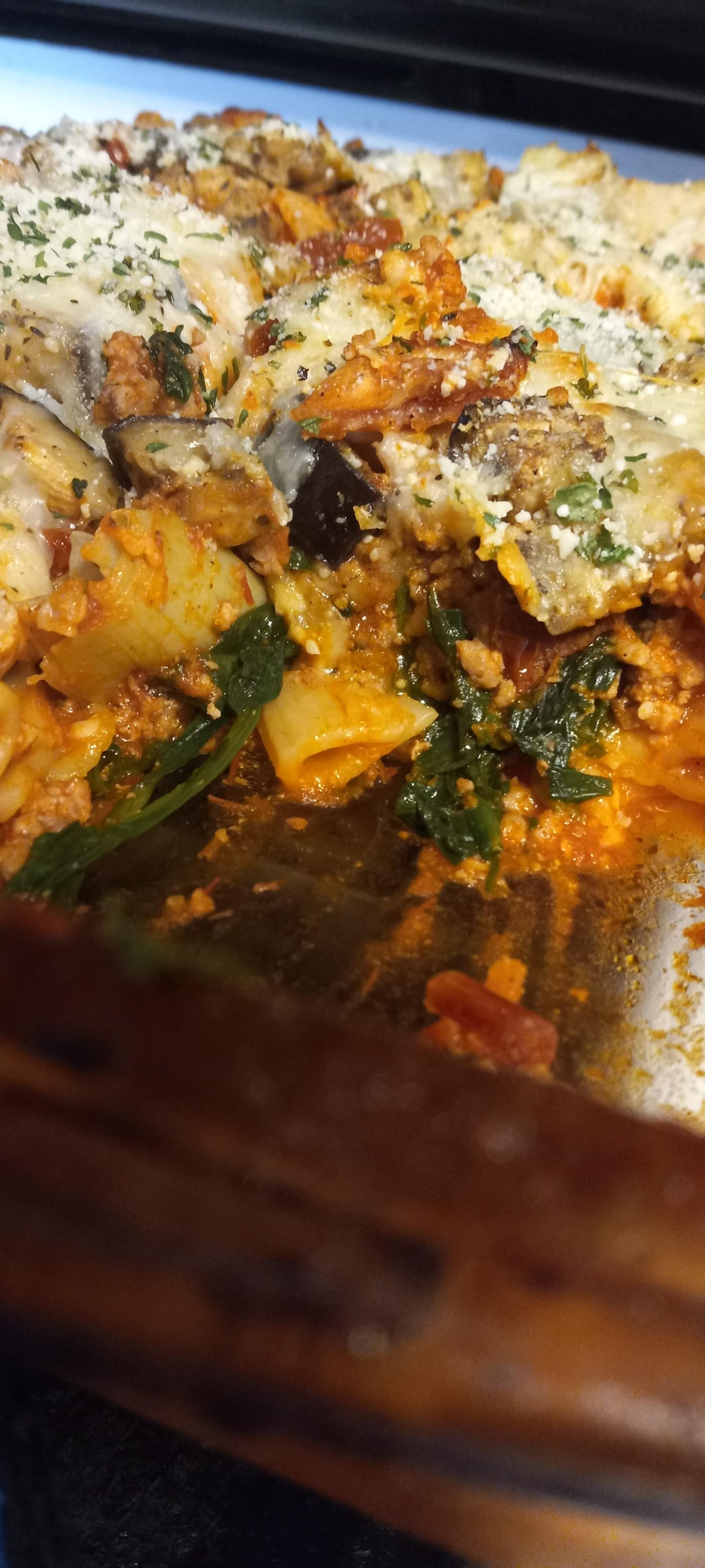 just went with the flow used what I had available didn’t have any recipe in mind but ended up with this. It had ground pork spinach sun-dried tomatoes eggplant artichoke hearts roasted garlic Romano cheese Parmesan cheese asiago cheese and mozzarella cheese. The sauce was a scratch made tomato and basil sauce.