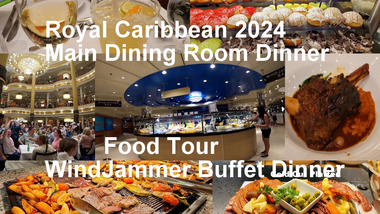 Dinner day one American Classics on the menu Tonight Roasted tomato Soup escar goes a la bin yard chilled shrimp Cocktail crispy crab Cake Southern Fried Chicken Aromatic chicken SOG popadom and Roe Herb crusted stuffed PTO Bello Royal cheesecake Boston cream Pie a taste of France Menu Creamy butternut squash Soup crispy buttermilk Calamari herb crusted Salmon Seafood linguini warm apple Cobbler cream Bruy day three A Taste of Mexico Menu roasted pablano pepper Soup tortilla Soup grilled sweet corn Cake chili lime crusted salmon pulled pork Enchilada coconut layered cake Trace Leches day four a taste of Caribbean Menu Asian style pork bow tacos crispy coconut jumbo Shrimp tofu and avocado salad green lentil soup jerk seasoned pork Chop Caribbean style Chicken garlic her butter tiger Shrimp pineapple sunshine cake warm blueberry Cobbler celebrating Caribbean night with song and dance performance from our dining staffs and fellow Cruisers Day five A Taste of Italy Menu day six Bond Voyage menu Chilled shrimp cocktail pants seared Asparagus Seafood cake Mediterranean toas Medley pecon crusted Salmon brazed Lamp Layered Peach Trifle crma Catalana a big thank you to all the friendly and hardworking staff who provided such good service let’s go check out the Wind Jammer Buffet a selection of freshly baked bread is offered Daily The salad station also offers a variety of vegetables to choose From cheese platter and different cold cut Meats Ready mixed salad cups are available Too you can also choose your favorite salad sauce toppings and condiments look at these assortment of cheese so artistically Arranged It is always busy at the grilled station during dinner peak hours at times you will see a queue of diners waiting for their steak checking out the carver station which offers different cut of meats on different days there are two types of soup to choose from at the soup Station here are some of the hot food items which are off on our first Day And I catching display of sweet treats here there are red velvet barer Mata barer DL Berliner white chocolate donut and many more Choices we are now on to day two dinner featuring saber La France theme night roast porkloin at the carver station delicious Coke oven available here we did not have this dish in the main dining menu and I just had to try it it tasted very good here are the rest of