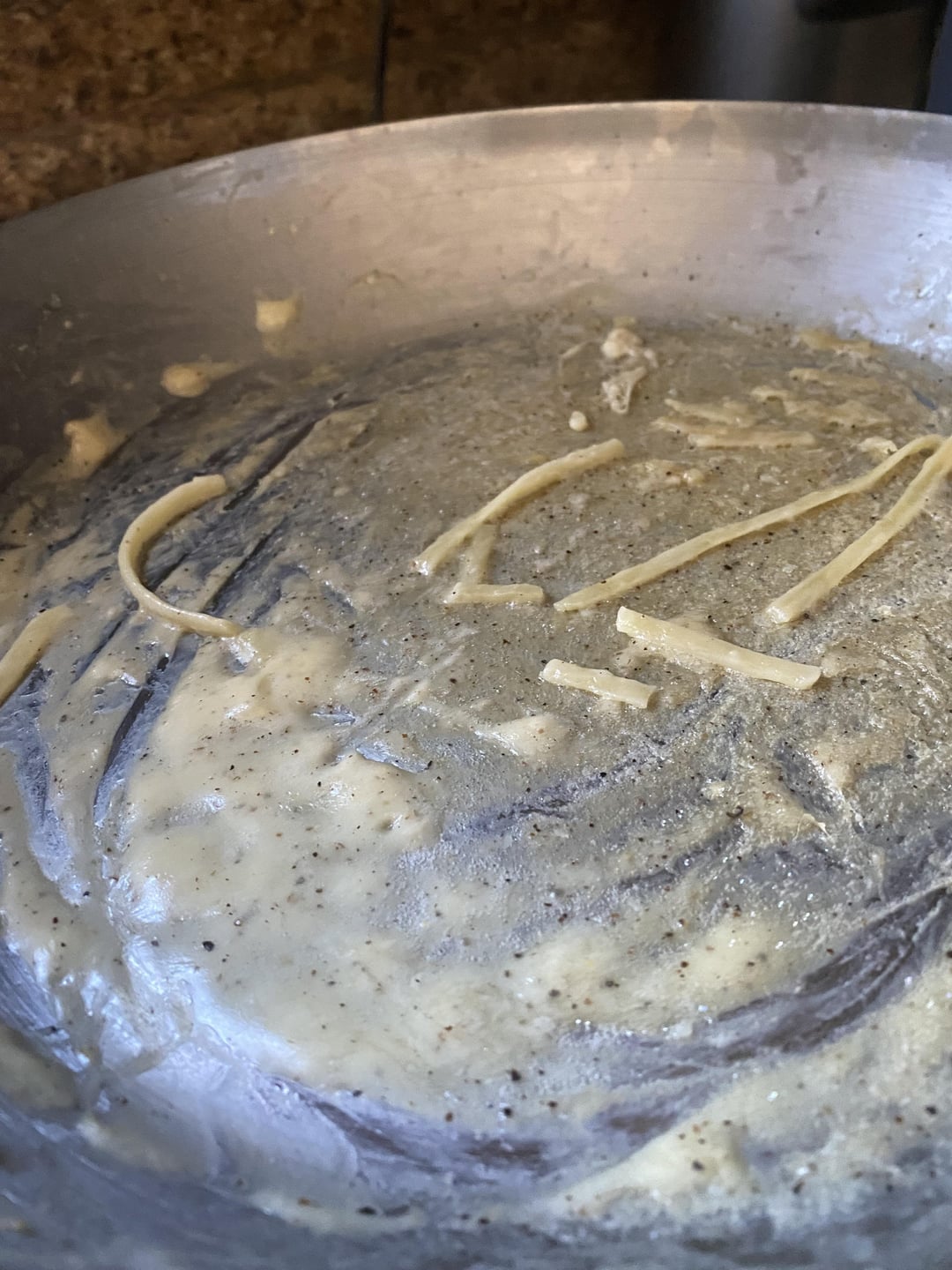 Now add a little more pasta water and a lot of pecorino Romano cheese grated very finely.