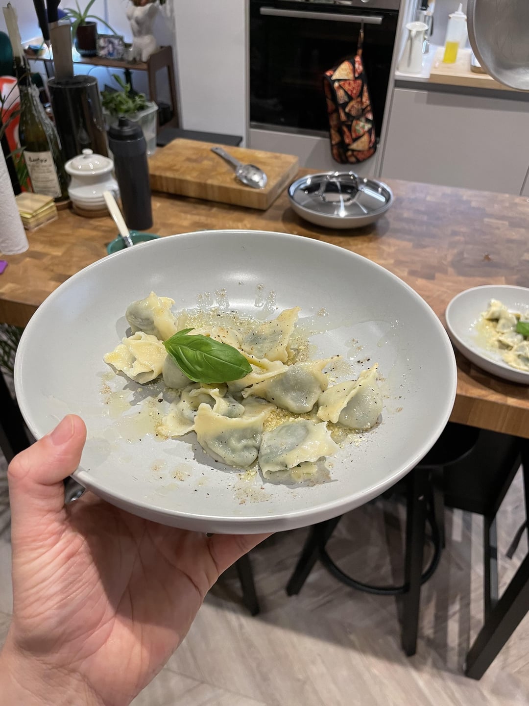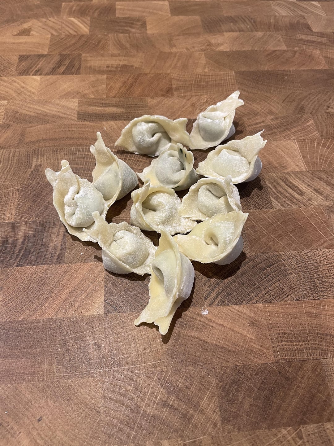 The tortellini were made with a semolina dough and filled with spinach, vegan ricotta and wild garlic.