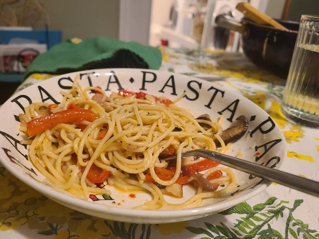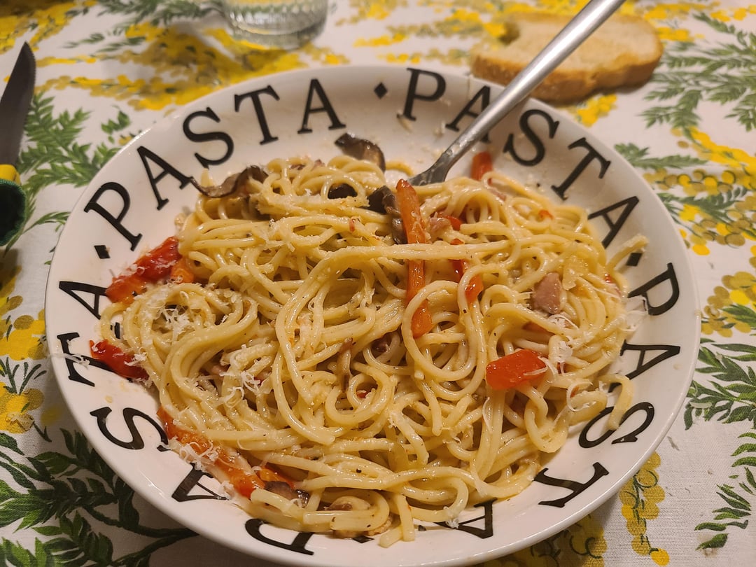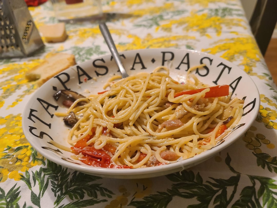 Spaghettini con bacon, funghi portobello e peperoni. Un po d’olio exrtra vergine d’oliva, pepe, Parmigiano reggiano.