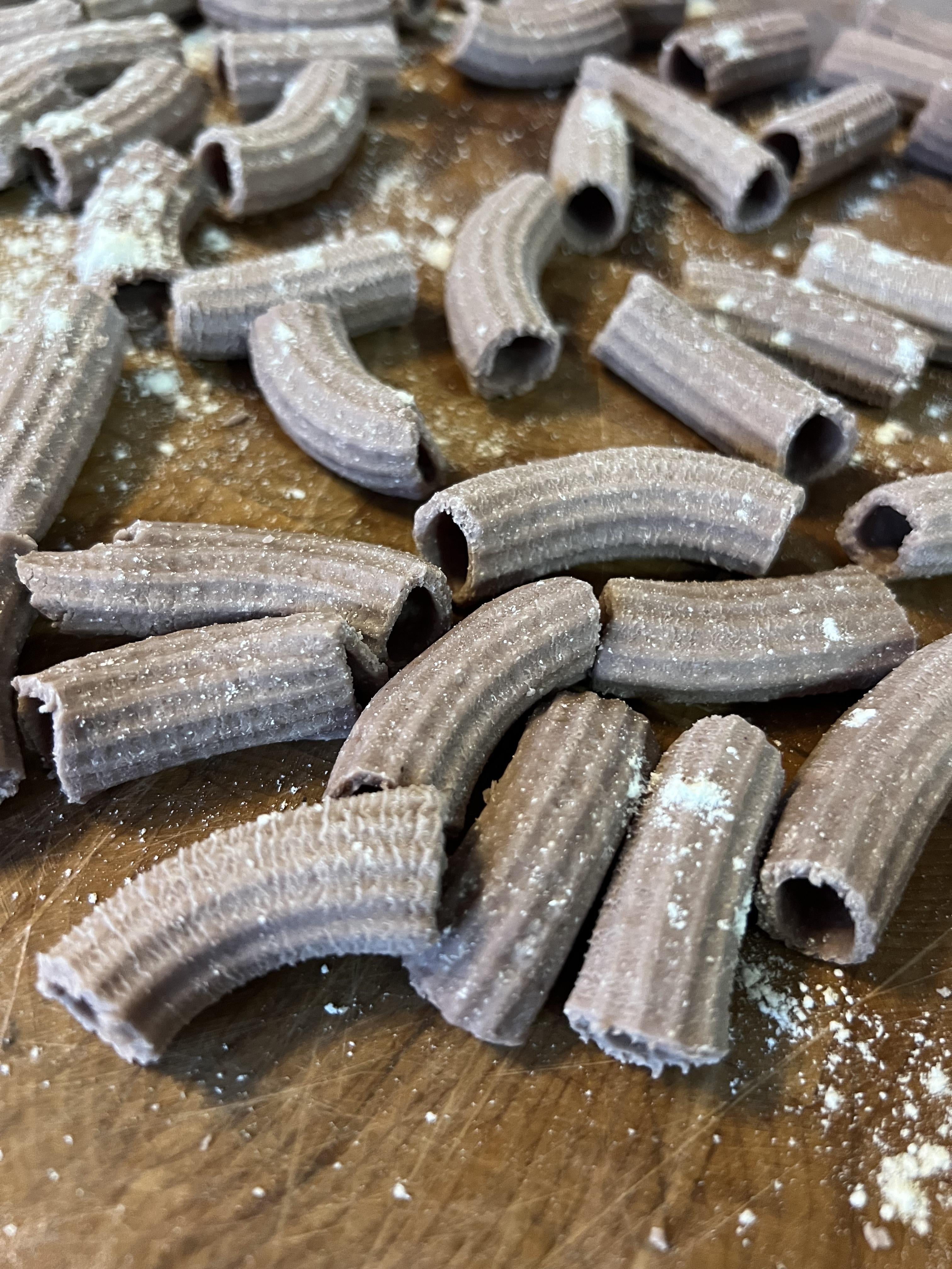 1 cup of semolina flour, 1 3/4 cup AP flour, 4 eggs, some purple sweet potato powder. Make a mound of flour, scramble eggs inside and add sweet potato powder. Knead together for 5 mins. Roll into ball and let rest. Make it into rigatoni. Don’t make this, though. It’s so so ugly. So ugly.