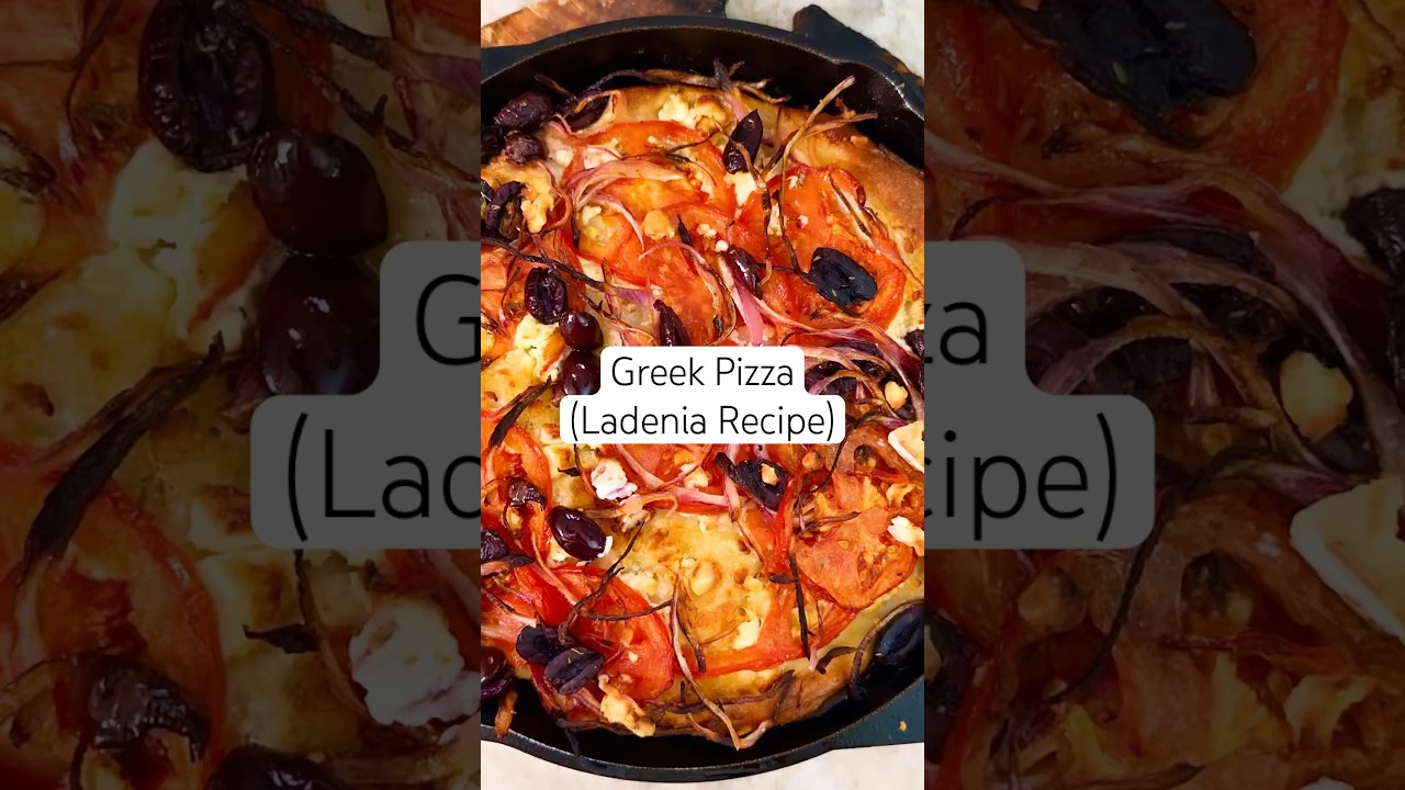 Ladenia better known as Greek Pizza in the U.S., is a delicious combination of ripe tomatoes, sliced onions, olives, and feta cheese on a fluffy freshly baked focaccia-style crust. Many cultures have their version of “pizza,” from Turkish Pide to Manaqish to Lahmacun. This Greek pizza dish, known as Ladenia, originates from the Island of Kimolos in the Aegean Sea. It combines the Greek olive oil flatbread and the Italian thick-based focaccia pizza to create a delightful dish. So why not enjoy the best of both worlds? #pizza #pizzarecipe #greekrecipes #greekfood #homemadepizza