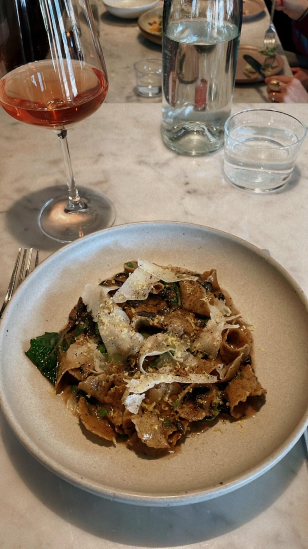 First pasta: Funghetti mushroom ragu w/ spigarello, kale, & cured egg yolk. Second pasta: Duck cappellacci w/ apricot, fava leaves & grilled ricotta