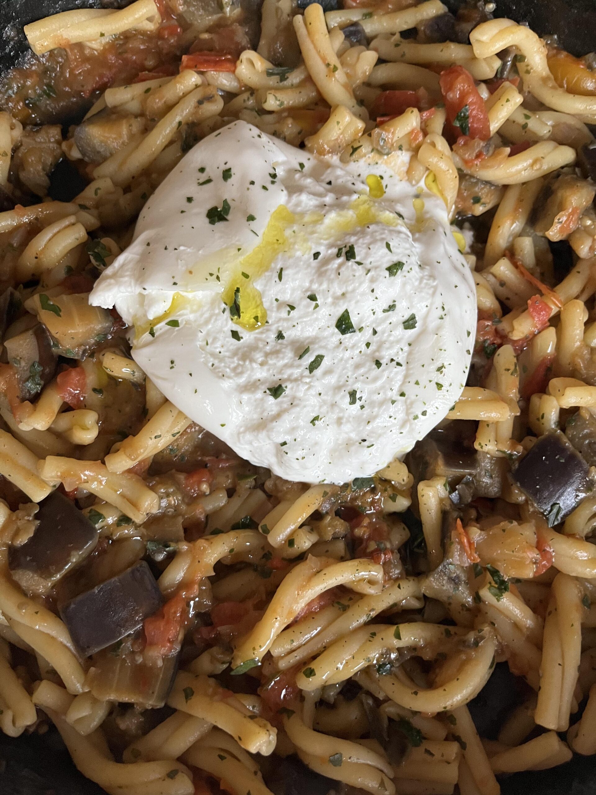 Another pasta (homemade strozzapretti) … roasted eggplant/aubergine with slowcooked cherry tomatos, some chili and basil in there as well. Served with a burrata. Pretty nice stuff!