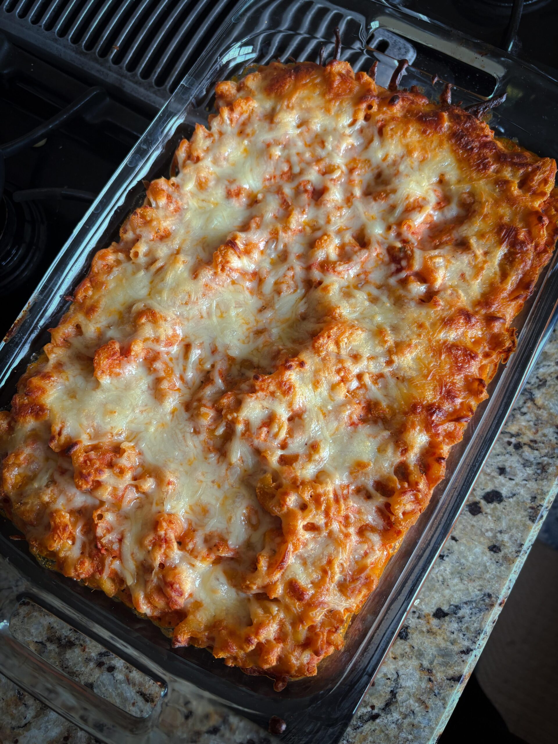 Boiled 16 oz elbow macaroni and drained it. Then I added 8 oz of ricotta & a jar of pasta sauce & stirred it up. Put it in a baking dish, topped with mozzarella & baked at 350 for 45 mins.