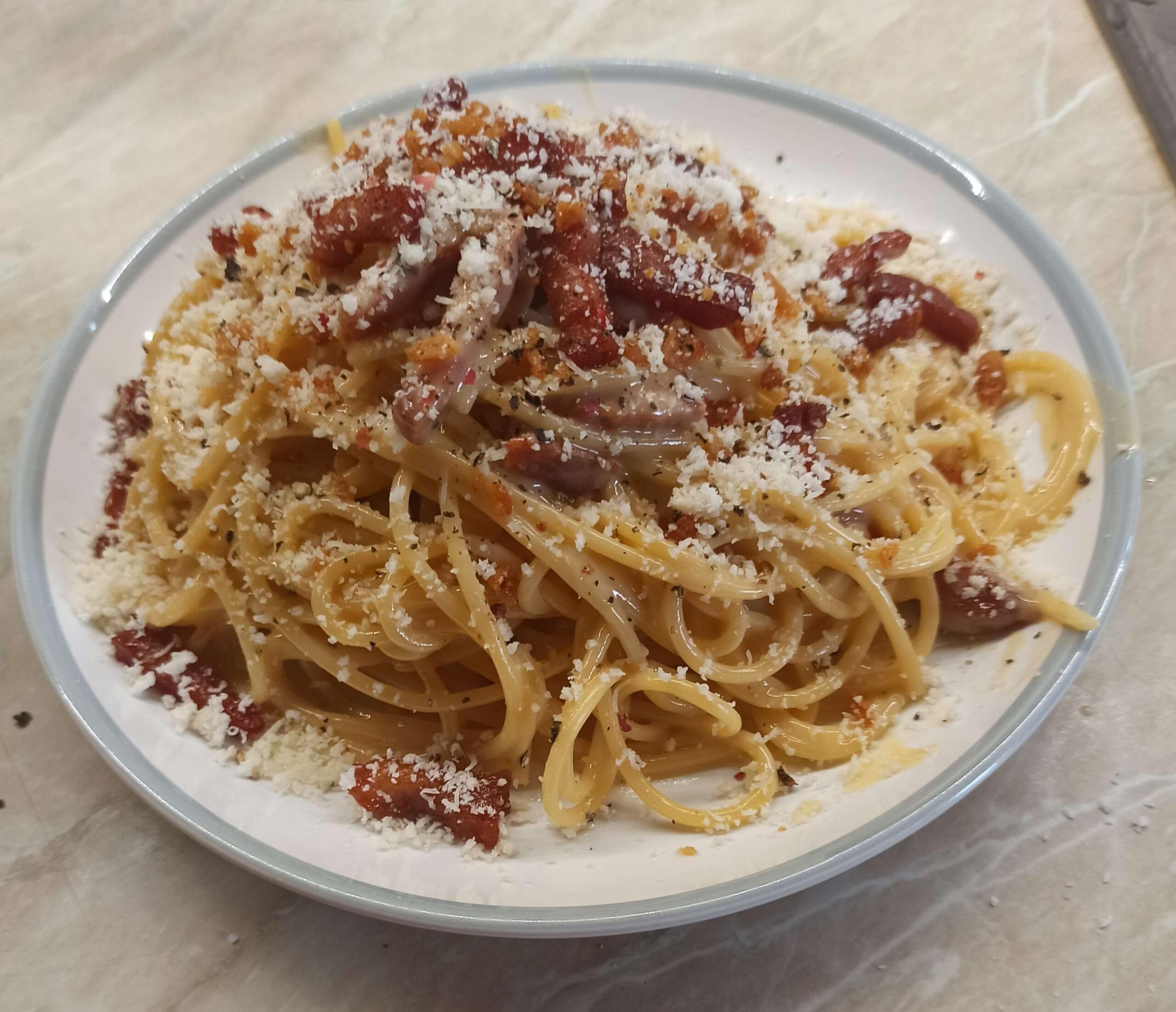 Prosciutto cut fat from meat and cook it on medium heat so the fat melts and you are left with crispy fat bits, then i added prosciutto into the melted fat and cook on max heat until crispy (i found that if i cook it on low or medium heat the prosciutto will be tough and not so enjoyable that way). When done, add spaghetti and egg mix (i use whole egg, a lot of black pepper and 50g pecorino per person) and mix, finally serve and top with extra pecorino, black pepper and sprinkle with the crispy fat bits.