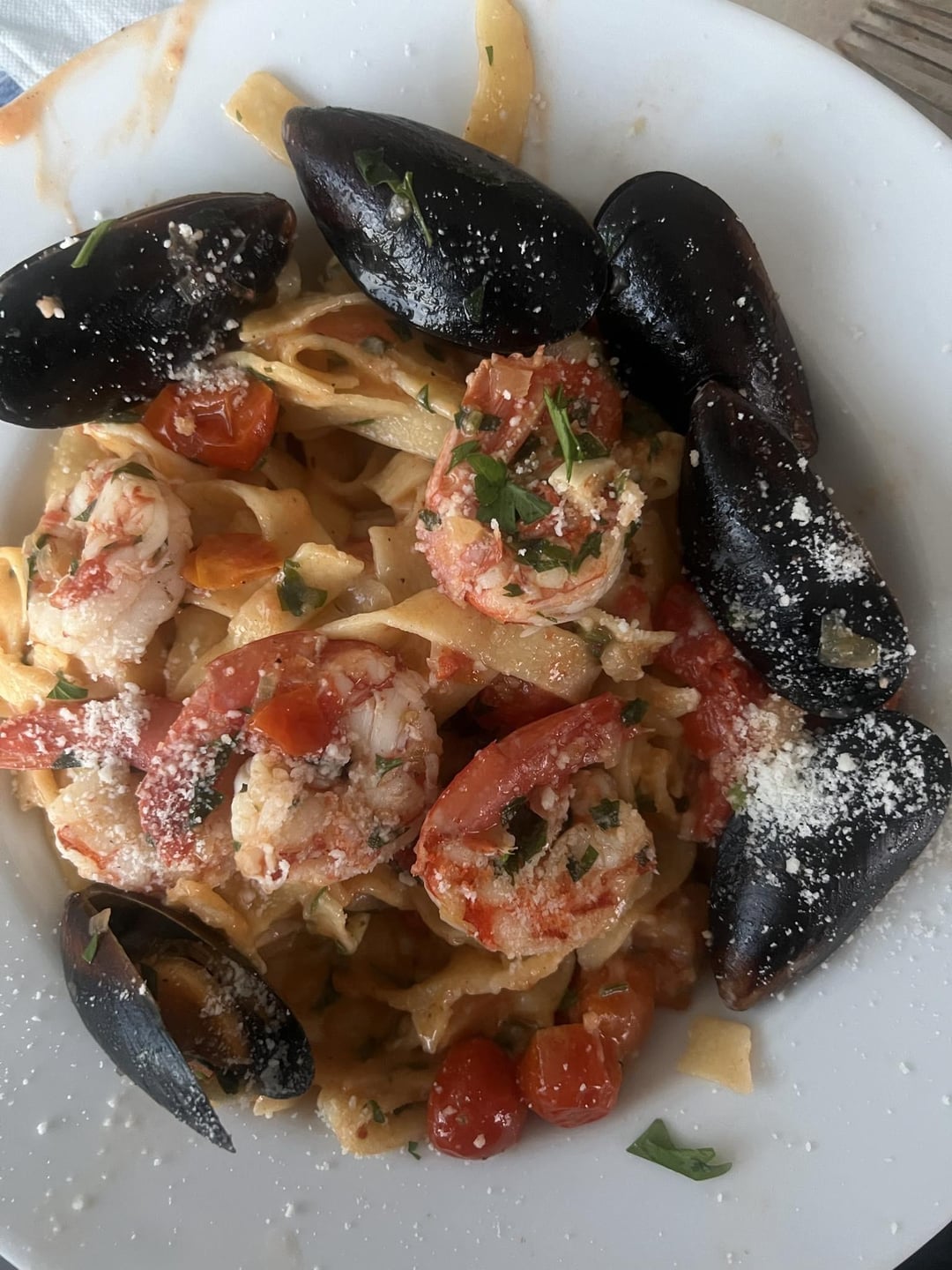 Sauce contains, fresh king prawns and mussels from local market, chardonnay, barsley, shallots, garlic, onion, parmegianno, pasta water, salt, pepper , salt and chilli pepper flakes.