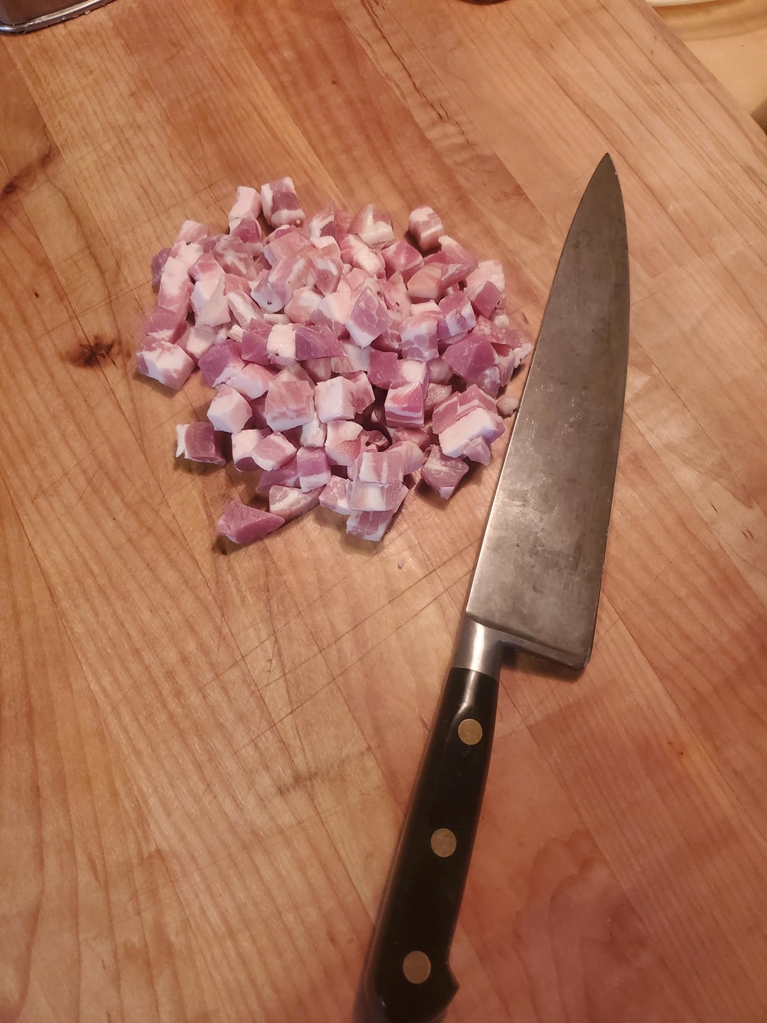 6- Dice the pancetta (butcher didn’t have any guanciale, and pancetta is often better anyways, guanciale is 90% fat sometimes)