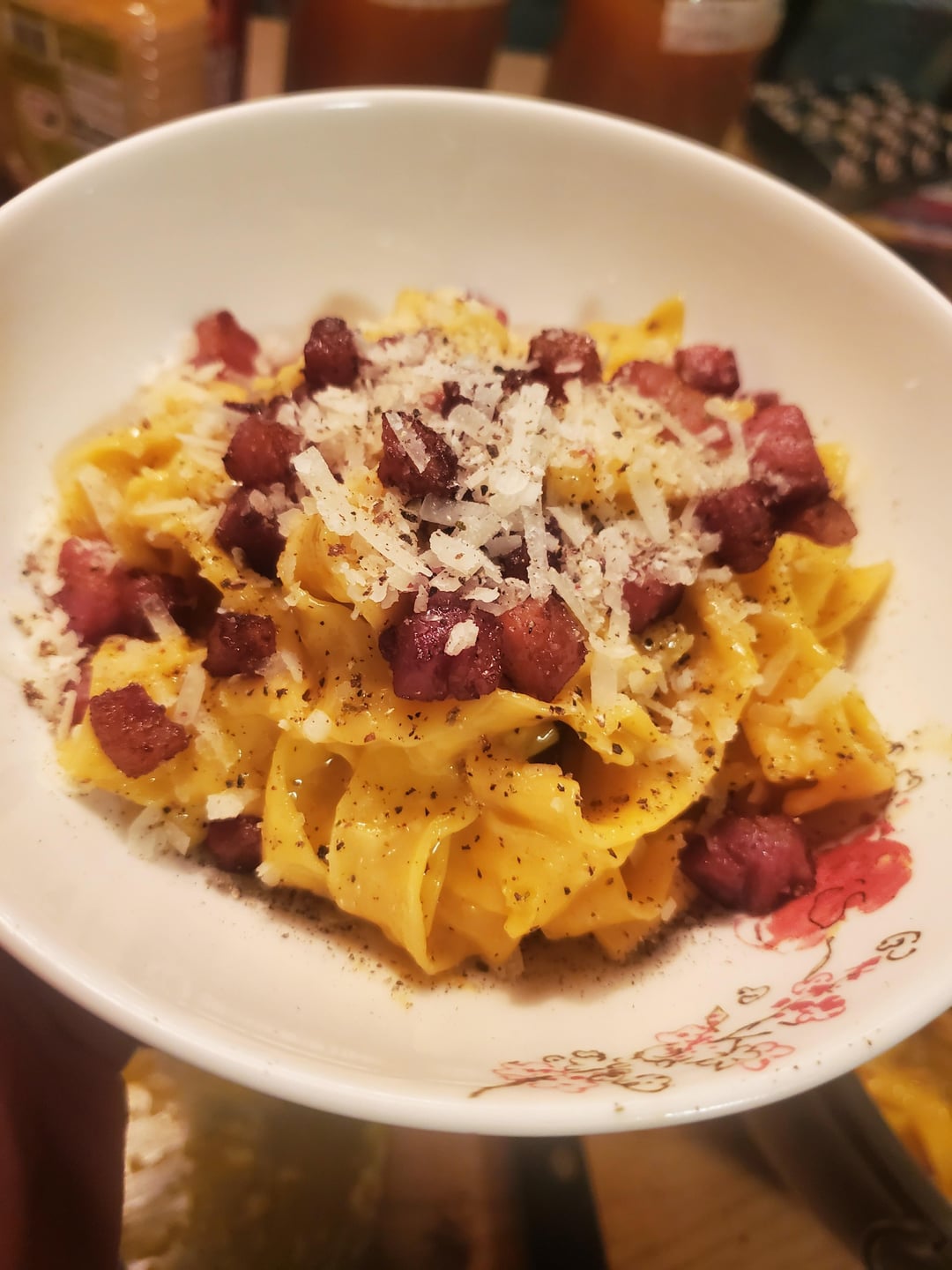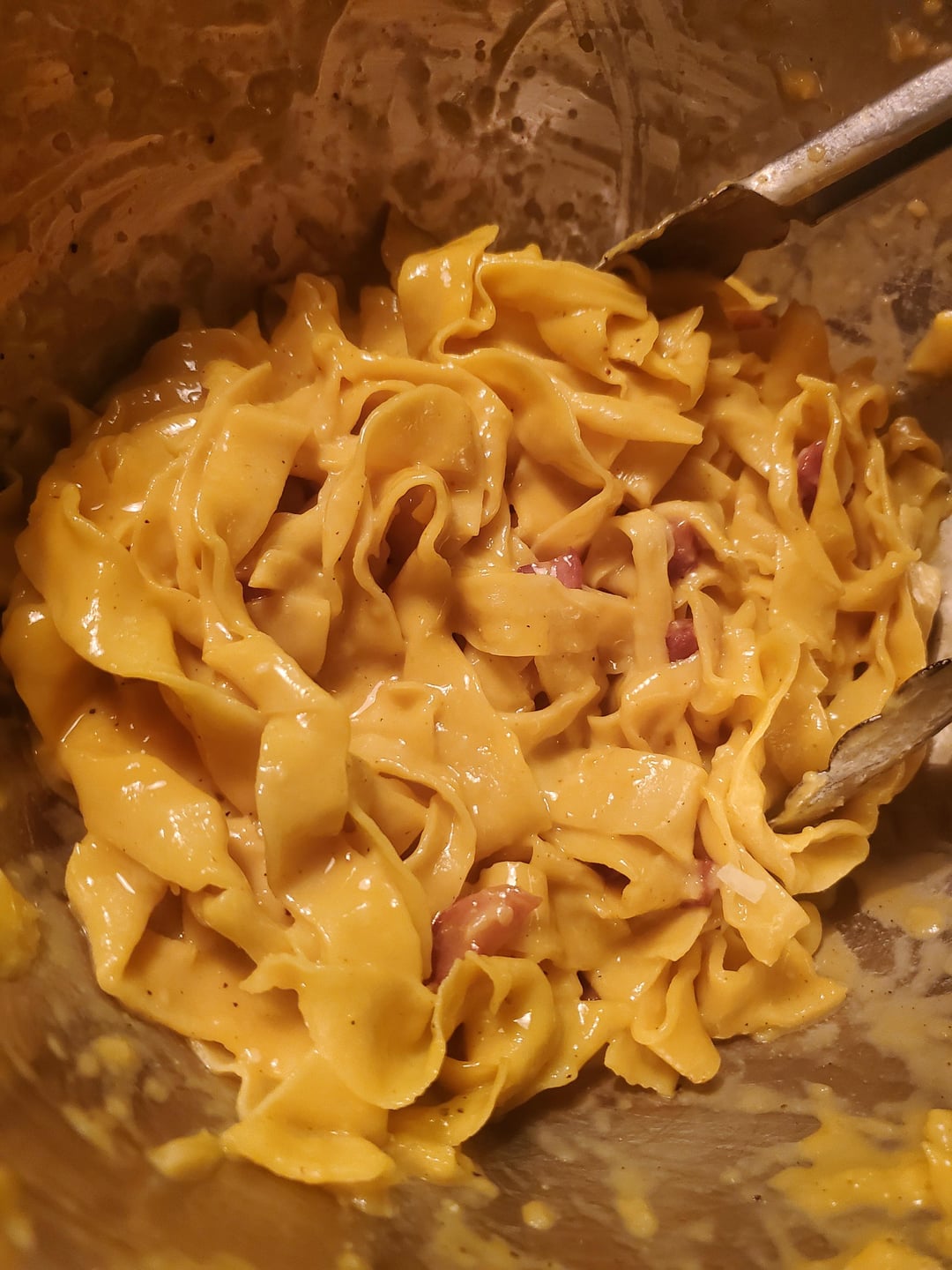 8- pasta directly from the boiling water into a big bowl with the egg & chez & pancetta mix, then mixmixmix stirstirstir. Add a splash of pasta water if needed to get a smooth consistency.