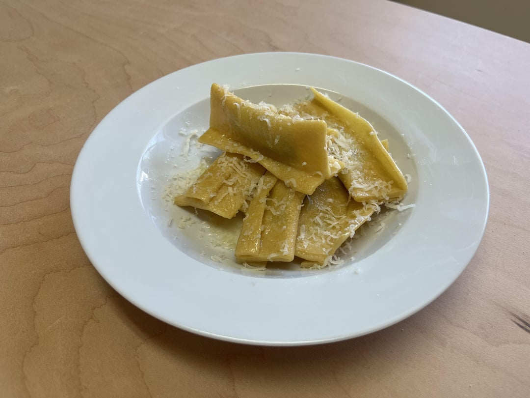 The filling is ricotta, parmigiano, salt, spinach, sausage, and spinach. Tossed with a butter sauce.