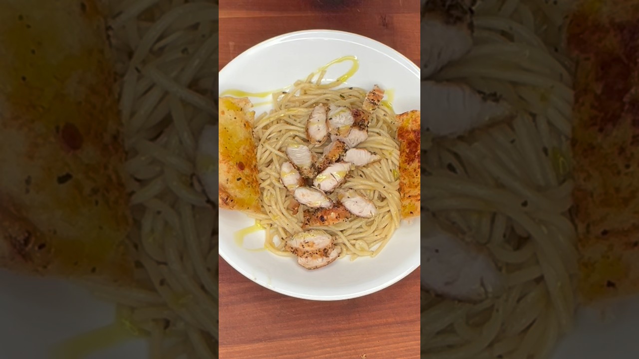 To add more flavor to this classic, I started off by searing some Italian seasoned chicken breast tenderloins in a pan, then deglazing that pan with some white cooking wine before adding the garlic and some butter to get my sauce started. Then adding thin spaghetti cooked to one minute less than al dente right to the pan and tossing it around to coat with the sauce just adds a ton of flavor! Adding in some of that salty and starchy pasta water helps to emulsify that sauce to give a rich and flavorful sauce that clings to the noodles beautifully. Finish with a drizzle of Graza Drizzle finishing oil and some freshly grated parmesan cheese, plating it up with the sliced chicken and some crispy garlic bread, and you’ve got an epic meal in less than 30 minutes! Don’t Eat Boring Food!!