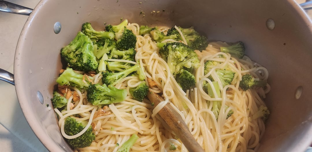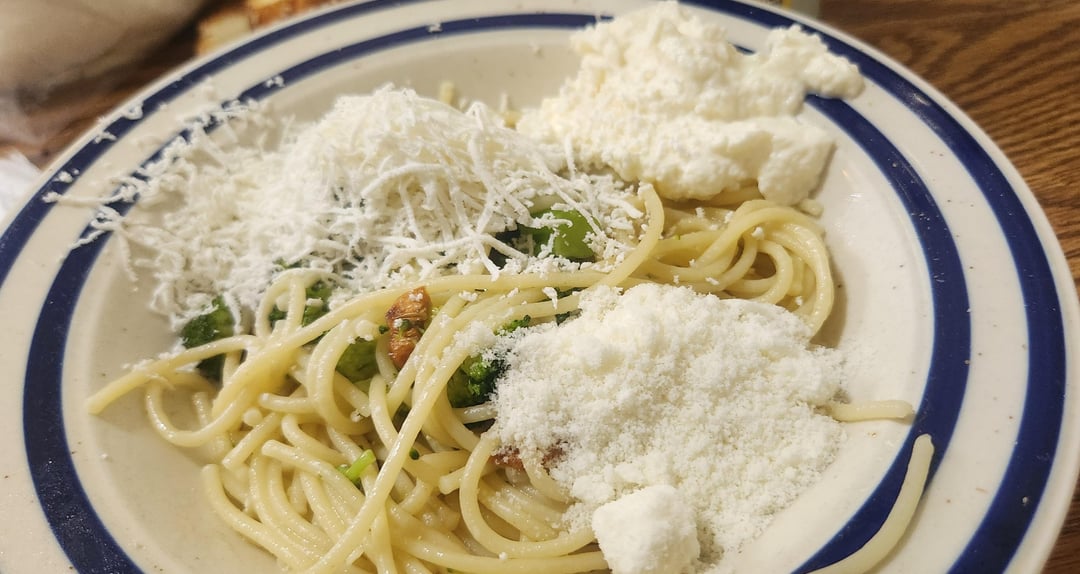 Spaghetti with garlic and brocolli fried in olive oil w fresh ricotta, ricotta salata, and parmegianno regianno mangia!!!!