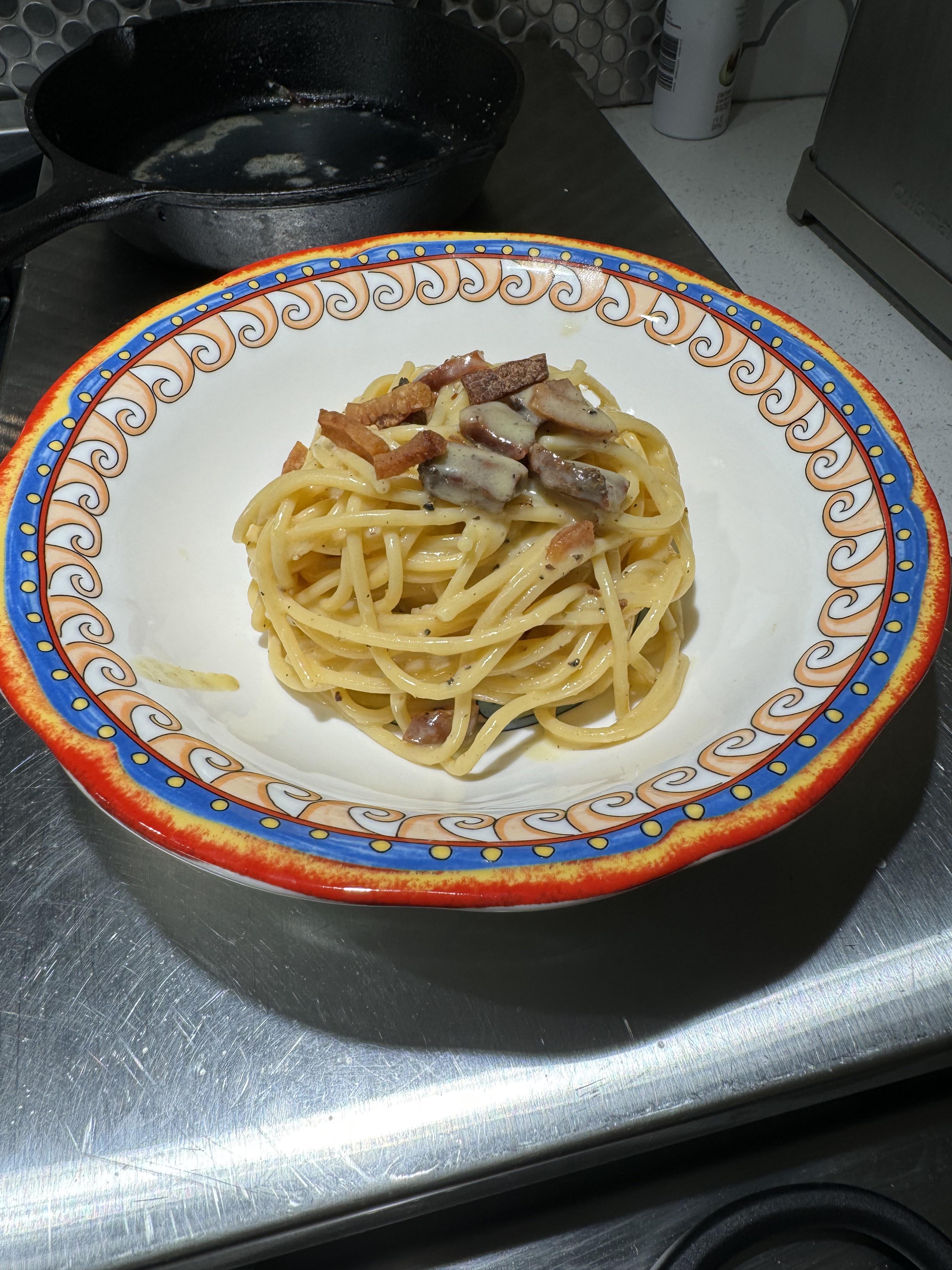 Only 5 ingredients egg, pecorino Romano DOP, IGP spaghetti, guanciale with its fat.