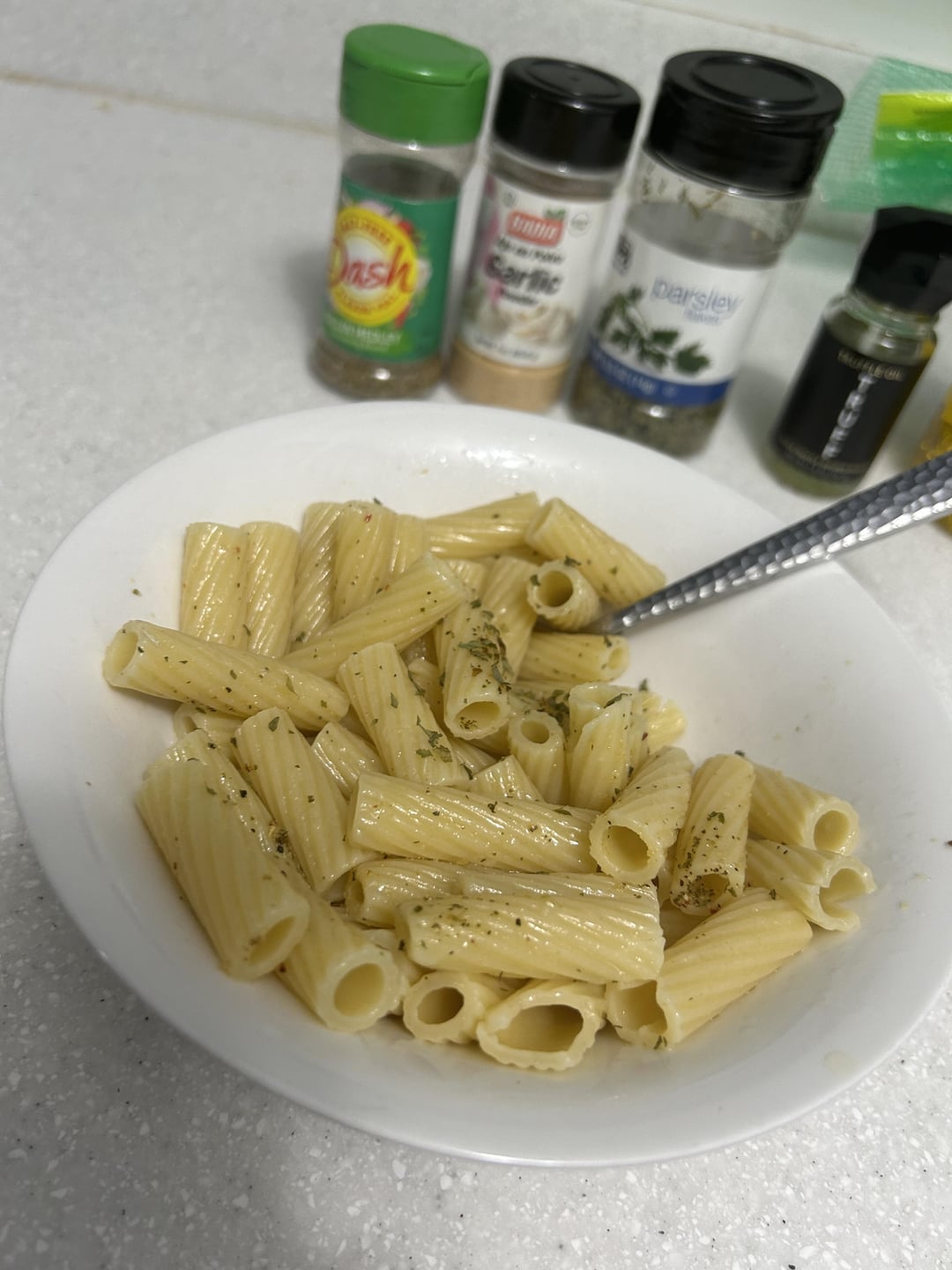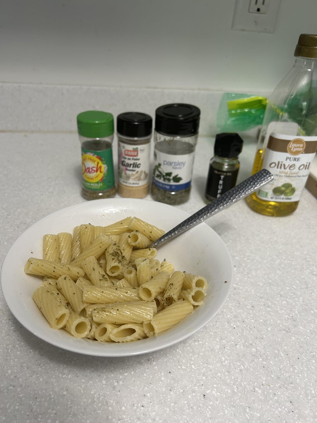 New to cooking and stuff, had gotten the truffle oil as a Christmas gift and needed to use it at some point. This is the first time I’ve actually cooked something without my parents. I feel like I did a better job at cooking my pasta than my parents and I’m really proud with myself! It’s just some store brand rigatoni boiled with salt, some Italian herb seasoning blend with a little extra garlic I like, truffle oil and some more olive oil to dilute it since I didn’t want to waste too much, and some parsley because it makes it look less bland. Literally teraly everything is just random stuff I found in the pantry I put together. It was good 😀