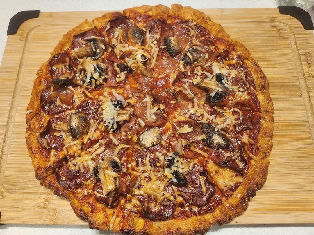 Thoughts on gluten free pizza recipe #1108 ? Fold test included! This dough is a dab of brown rice flour, a fair serving of coconut flour, potato flour, white rice flour, and dock seed flour. No oil or salt, and a minor amount of sugar! This recipe is ~110 calories/slice in an 8-slice pizza!