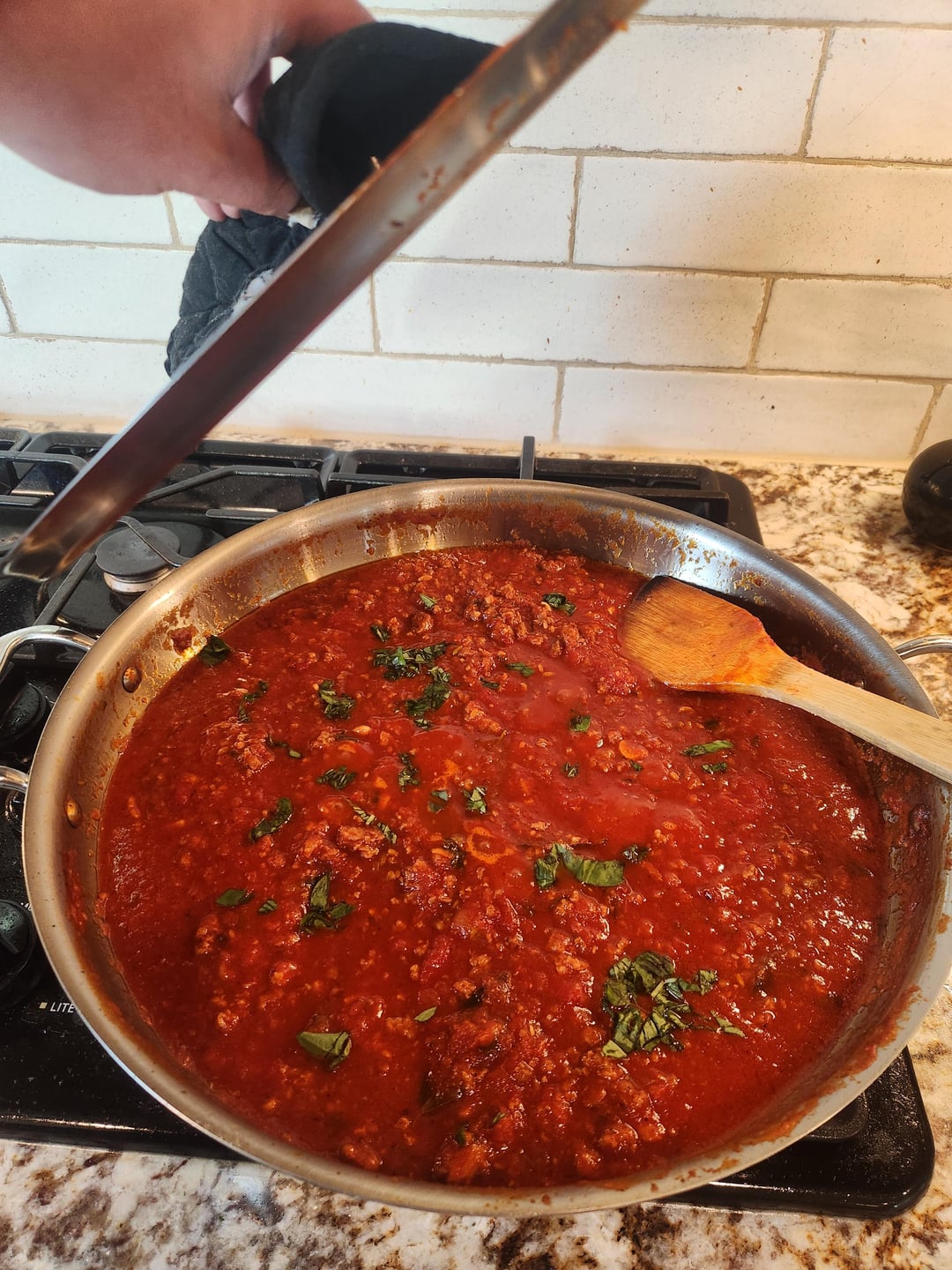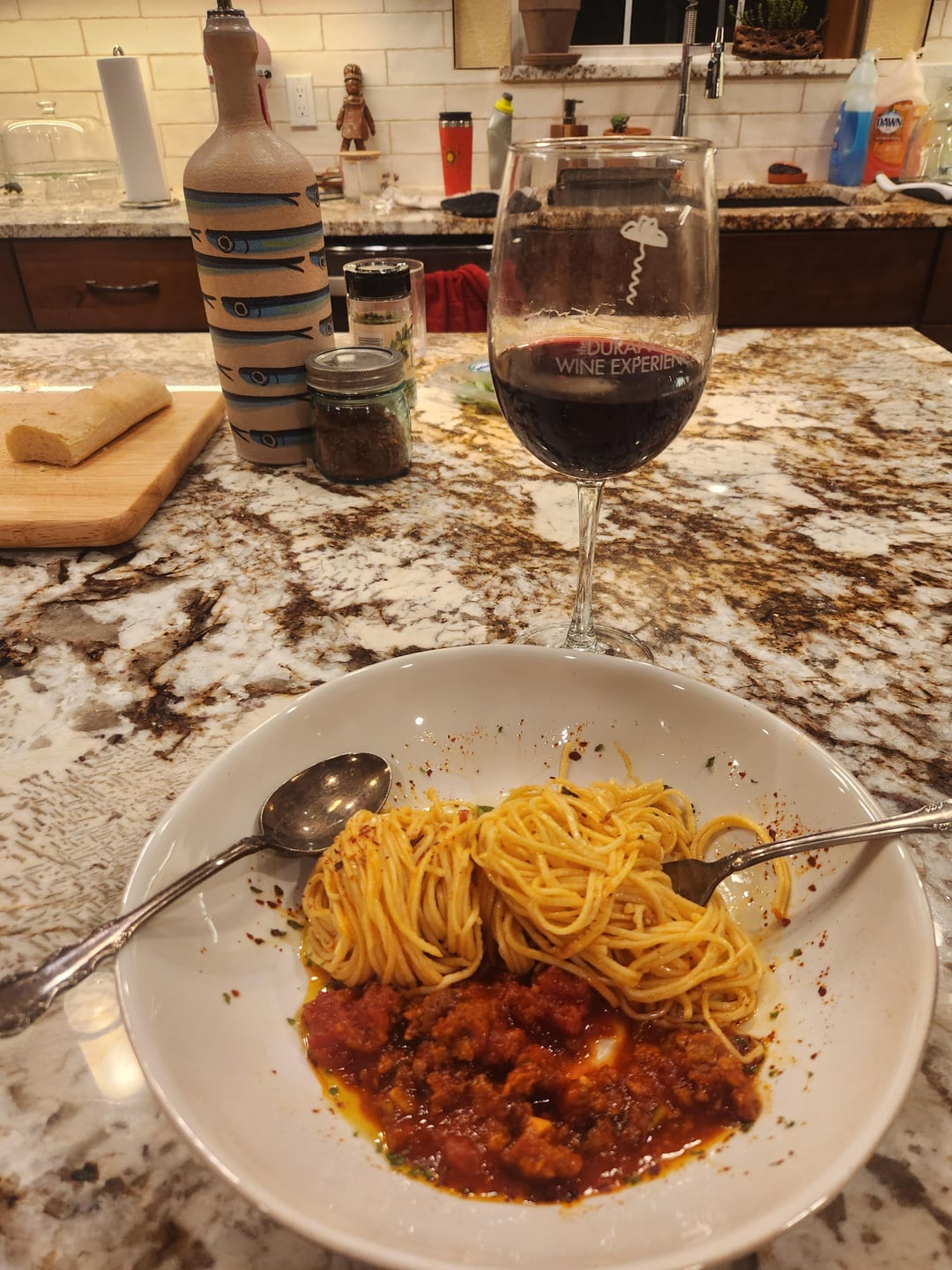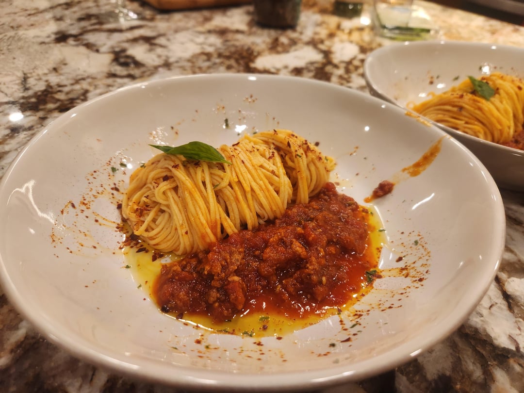 It needs to be mixed in the pan, I know it looks pretty for the picture having the pasta next to the sauce but you’re killing it by leaving it like that and not tossing in the pan with the sauce, Also, according to your ingredients, that is not a Bolognese, probably closer to a Spaghetti alla Buttera