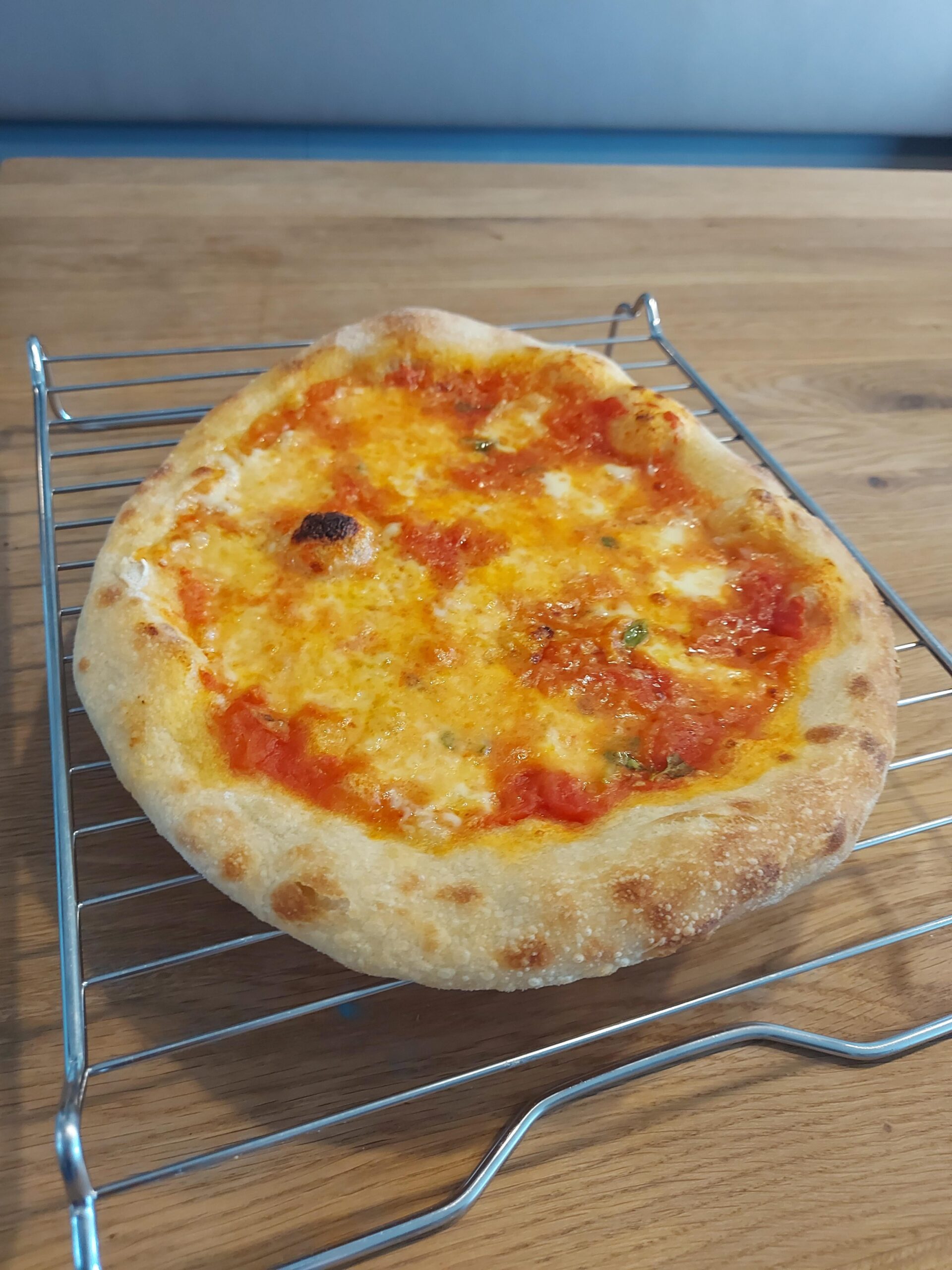 I baked it in a home oven that reaches 300C, on a pizza stone, top position. In retrospect, it could use maybe 1-2 minutes without the pecorino/ mozzarella.