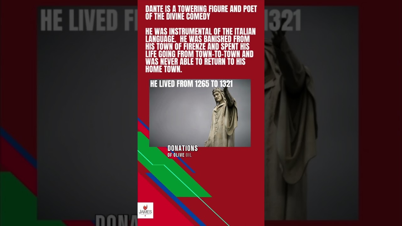 James melendes this is how to pronounce words in Italiano Dante is a towering figure and poet of the Divine Comedy he was instrumental in the development of the Italian language we know today he was banished from his hometown of fenza and spent his life going from town to town and was never able to return He ended his days in the city of Ravena since 1908 the City of Florence has maintained a lamp at Dante’s tomb in the raena donations of olive oil from the citizens of Toscana and fenza keep this lamp perpetually lit in honor and homage to one of their favorite Sons pronunciation is Dante aleri Dante aligi Dante aligi I appreciate you watching please give a like subscribe to this Channel and come back for more reviews as well as how to pronounce videos Gra