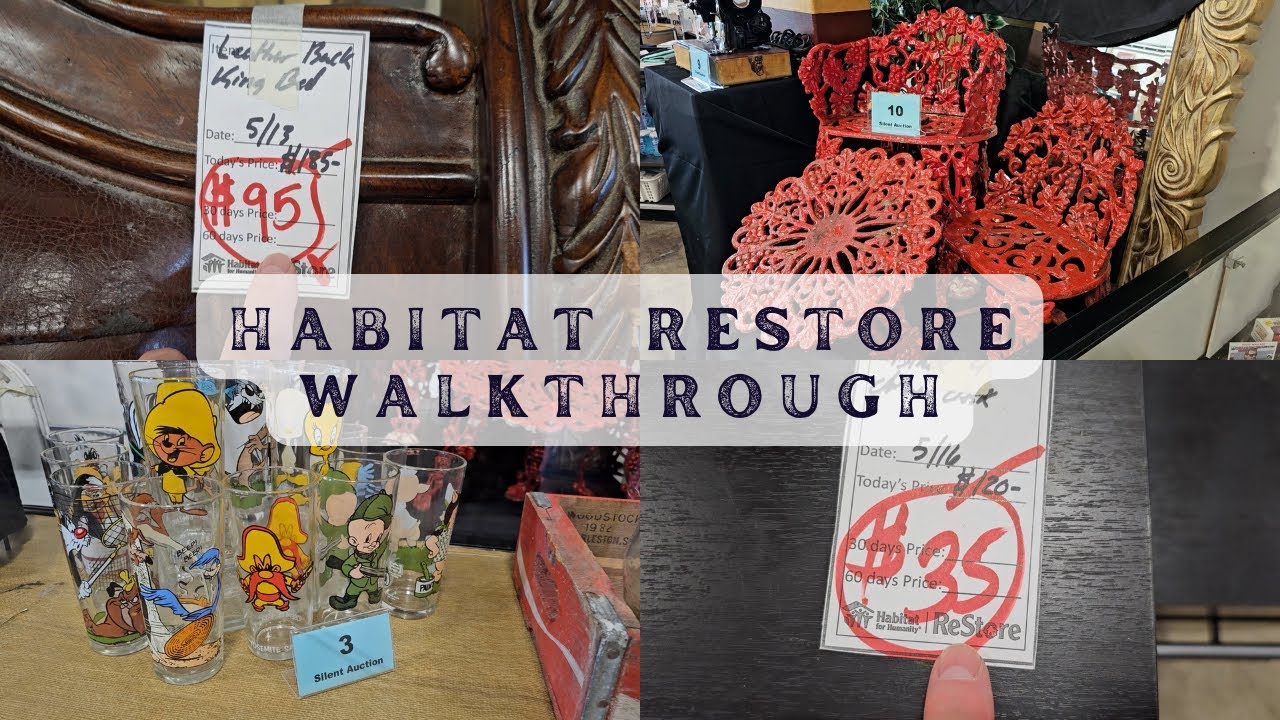 [Music] y’all know I love it when I walk up to my restore and I see these buggy loads of items so they’ve got these pillows let’s see $150 each oh that one’s pretty oh and I think we’ seen that one last week $150 and you know if they’ve got pricess this good outside I can’t wait for us to get inside and see what they’ve got this restores ours are Monday through Saturday 10: to 4:00 and I’ll list their address in the description box below H here we go and here’s a shot around the store and y’all know we’re going to get into all the areas and I got to tell you they’ve got tons of markdowns here here’s a large Gallery wrapped canvas for $1450 and here’s a set of eight wooden chairs for $150 oh they’re so fancy [Music] [Music] and I really like the table they’ve got it paired with it’s got a lazy Susan they’ve got this table prize for [Music] $300 and here’s a Hamry bookcase for 100 [Music] [Music] and y’all know how much I love the lamps at the restores this one’s only $15 and they’ve tested it it works oh so Fancy Love The Fringe and they had two of these and this is what I’m talking about with their markdowns normally 85 they’ve got it marked down to 68 it’s a leather club chair and I don’t know if y’all can hear in the background it is coming a storm here thundering lightning the rain against the window I hope I don’t get zapped and here’s a large three-piece wall unit they’ve got it marked down to $300 and when I say large look at this thing I’m backing up I’m trying not to trip over furniture and I met another one of our sweet little fur babies at the restore this day hey byy hey a you are so cute oh he’s soft too I hope yall have a good day thank you Bucky was so sweet and I tell you what I bet Bucky would match this rug this rug’s only [Music] $75 here’s a large area rug it’s a 9 by2 for a little over $100 I love those colors in it and I like this China hutch it’s only 125 look at that fret work on it [Music] [Music] you know I have to open those drawers so AJ established 1993 it’s American journey by Basset Furniture fantastic piece and they had two of these blue Wing back chairs $32 each another great markdown so normally 185 we had seen this last week they’ve marked this huge KingSize bed down to $95 you know she deserved another look $95 [Music] [Music] bucks and just know when you shop your Habitat ReStore you’re helping someone else with home ownership and another great mark down normally 200 but they’ve marked it down to $100 this is that lattice back bench someone had converted an old dresser into a fantastic bench I think this would be perfect in a kids room as a toy box or if you’ve got room maybe in your entryway I love that [Music] idea and here’s one of their baskets and I fun the best baskets of these restores this large basket’s only $1250 and here’s one of their pillows [Music] 450 and this white distress dining table kind of gives me that shabby chic viob it’s [Music] $125 and y’all know this particular restore does a solid auction so we got to go through and see what they’ve got number eight is a matchbox NASCAR collection they’ve got an assortment of collectible Matchbox cars I see Richard Petty we actually call my mom Richard Petty she drives way too fast as far as I know she’s not gotten a ticket or at least she hasn’t told me number seven they’ve got labeled as a mushroom collection and they’ve got a 1970s large vintage arnell’s magic mushroom soup terrain and y’all know number six is some of my favorite finds here the day I wi they’ve got some vintage coin banks and the one in the front actually might be an antique coin Bank from the 1920s it’s called trick dog did y’all have little Banks like this growing up and the one in the back they’ve got it listed on Poshmark for $100 it’s a dentist bank I guess he pulls the guy’s tooth and the coin flies behind him oh those are fun and number five is a piece of vintage Hartman luggage that’s probably going to last [Music] forever and number four is a Coca-Cola collection and they’ve got a set of eight vintage Coke dimple and Pebble glasses and a set of six Tiffany frosted stained glasses oh and look at that old wooden crate and it’s stamped in the back got it Charleston South [Music] Carolina and number three was a fun throwback who had some of these classes growing up so it’s a set of 13 Pepsi collector series Circa 1970s Warner Brothers tumblers one Tumblr with yosity Sam was listed online for $25 y’all have to let me know who was your favorite I liked fog horn leorn he just can’t be be beat and number two is a Tom Clark gnome collection and they’ve got one that’s actually signed and several pieces have been retired in there do y’all have any things that you collect I’ve got a few of these gnomes I like Hummels and number one is a bride Cherry collection they’ve got this listed as a yellow kitchen collection and they’ve got a set of four Tupperware containers do y’all remember Tupperware out there that stuff doesn’t wear out and number nine is a Great Britain vintage Singer sewing machine and it comes with a case they’ve got it listed in excellent condition and they said it works and number 10 is a midcentury grape vine cast iron patio set online just two chairs $890 but these come with the table so if you want that good luck on bidding in the auction and y’all know I love the dishes you get seven pieces here for $9 and this is John madakin sons from England oh I just love it with the Clover and the daisy pattern gosh wouldn’t it be wonderful to have a whole set of those I think those are so [Music] pretty and here’s another great mark down so normally 48 they’ve marked it down to $38 it’s a vintage rocking chair and I am always running across the best deals on rockers at these restores and here’s another set of lamps $15 each and I ran across some fantas