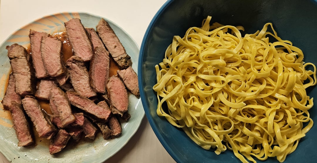 Total success! Definitely was more of an egg noodle taste (duh, it was mostly eggs so that's dumb of me to say) and would have gone great with some type of mushroom sauce. Steak was overcooked for my liking, btw, should have pulled it 3 minutes sooner.