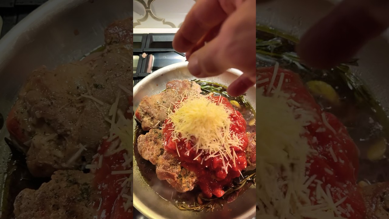 tonight is a simple healthy low carb classic pork brol we’re going to finish it in a light pomodoro sauce all right we start by frying the stuffed brael and garlic olive oil and fresh Rosemary let’s see oh yeah oh that’s beautiful right this brol is fresh from the butcher all right a beautiful dry mon Pano D Bruto is our wine tonight already started organic Sicilian Rosemary really makes a difference sh of red wine crushed tomatoes all right generous hunk of palm all right some parsley to garnish we’re going to cover this cooking on low for about an hour please join the family salute from like