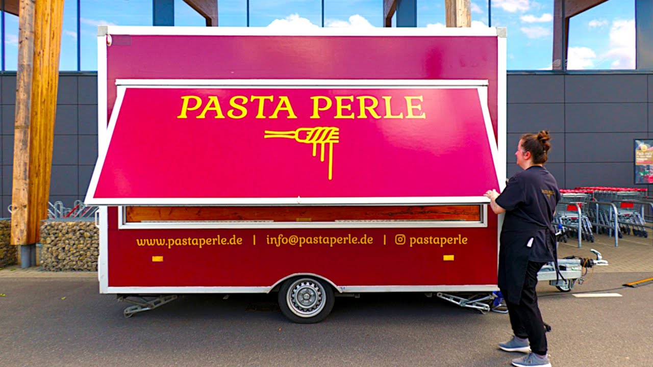 A Woman makes Street Food Pasta on Country – and Pasta is probably one of the most famous Street Foods in the World, which we would like to introduce to you in this “Street Food near Berlin Germany” Episode. The Pasta Perle Food Truck from outside of Berlin in the Countryside offers fresh Homemade Pasta from the Classics like Bolognese Pasta to Mac & Cheese Pasta to more Exotic Variations such as delicious Coconut Curry Pasta. She prepares all of this every day in her Kitchen & self-built Trailer.