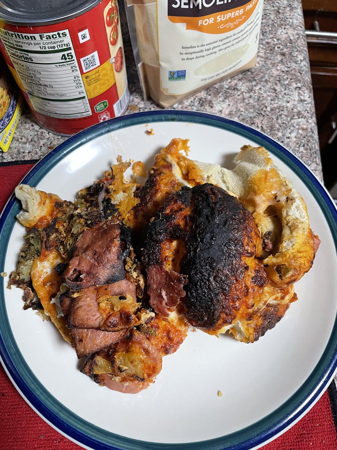 The first pizza round was a straight up mess! Like pizza!? It was more of a pizza pile. Second round was better but still not up to par for me. The first pile of pizza was delicious but it was a pile. The second one looks like an actual pizza. My style on the Hawaiian pizza which I never use pineapple on pizza AND it was delicious! Spam, pineapple, fresh chopped garlic, red onions, green onion s and tomatos with red sauce. 12” Pizzello pizza oven. Go ahead and roast me I deserve it! 😝