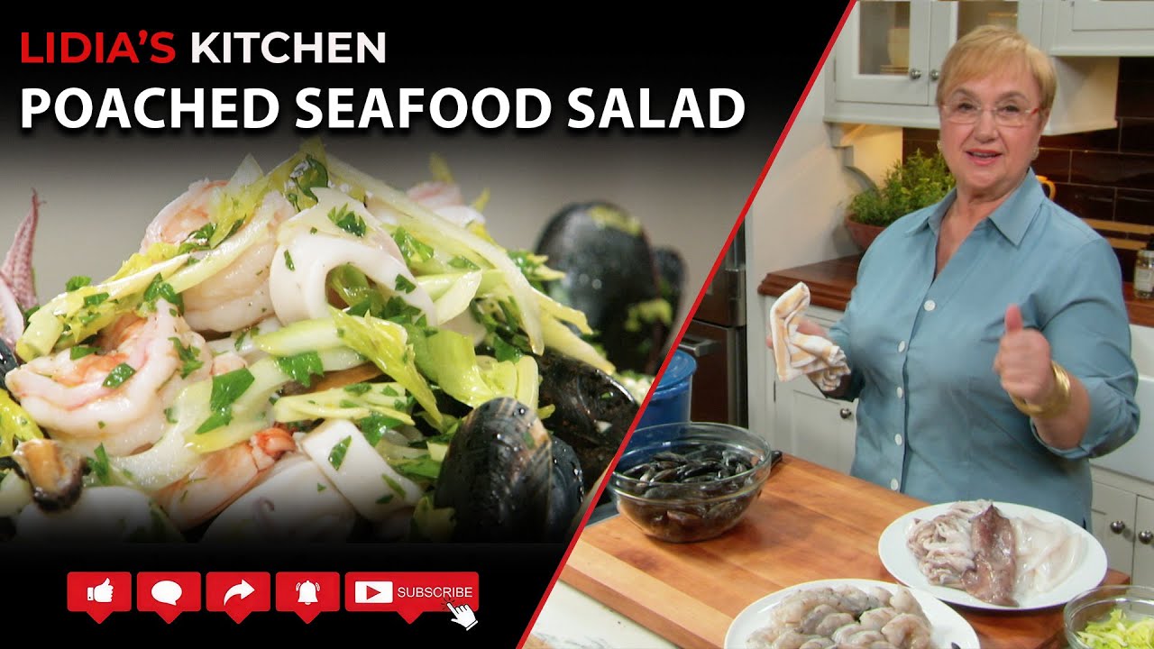 Poached Seafood Salad – a summertime favorite! This dish truly speaks of Italy. Every region of the country that is on the sea has some version of this seafood salad. It’s one of those recipes you can take in any direction you like. You can use whatever seafood is available—scungilli (sea conch), crabmeat, scallops, or any firm fish fillets. You can use lemon juice in place of part or all of the vinegar, and dress the salad up with capers, black olives, roasted peppers, or diced tomatoes, as you see fit. However you make it, it’s best prepared about half an hour before serving, to give the flavors a chance to develop. You can refrigerate the salad, but not for too long. And be sure to bring it to room temperature and check the seasonings before you serve it. When I am having family over, I know this will be a favorite, served in a large bowl on the table—everyone digs in. Tutti a Tavola a Mangiare! #LidiasRecipes #LidiasItaly #LidiasKitchen #LidiaBastianich #ItalianFood #FromLidiasTableToYours #LidiasSoundtrack