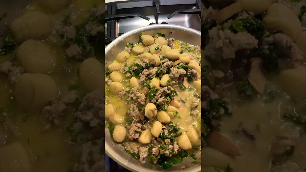 okay noi sausage and spinach takes only 20 minutes to make might be your greatest creation ever all right we start with chopped onion garlic frying up in our beautiful olive oil now we’re going to fry up some chopped Italian sausage in with the Chili Peppers little spicy water for the noi the sausage is nice and brown we had diced mushrooms chopped spinach little heavy cream oh yeah nice shot of Parmesan reanal all right we’re going to mix that all up Let it cook about 12 minutes I’m going to pair this with a full body Naro davola salute Y is ready when it starts to float to the topi in the sauce as that was delicious what