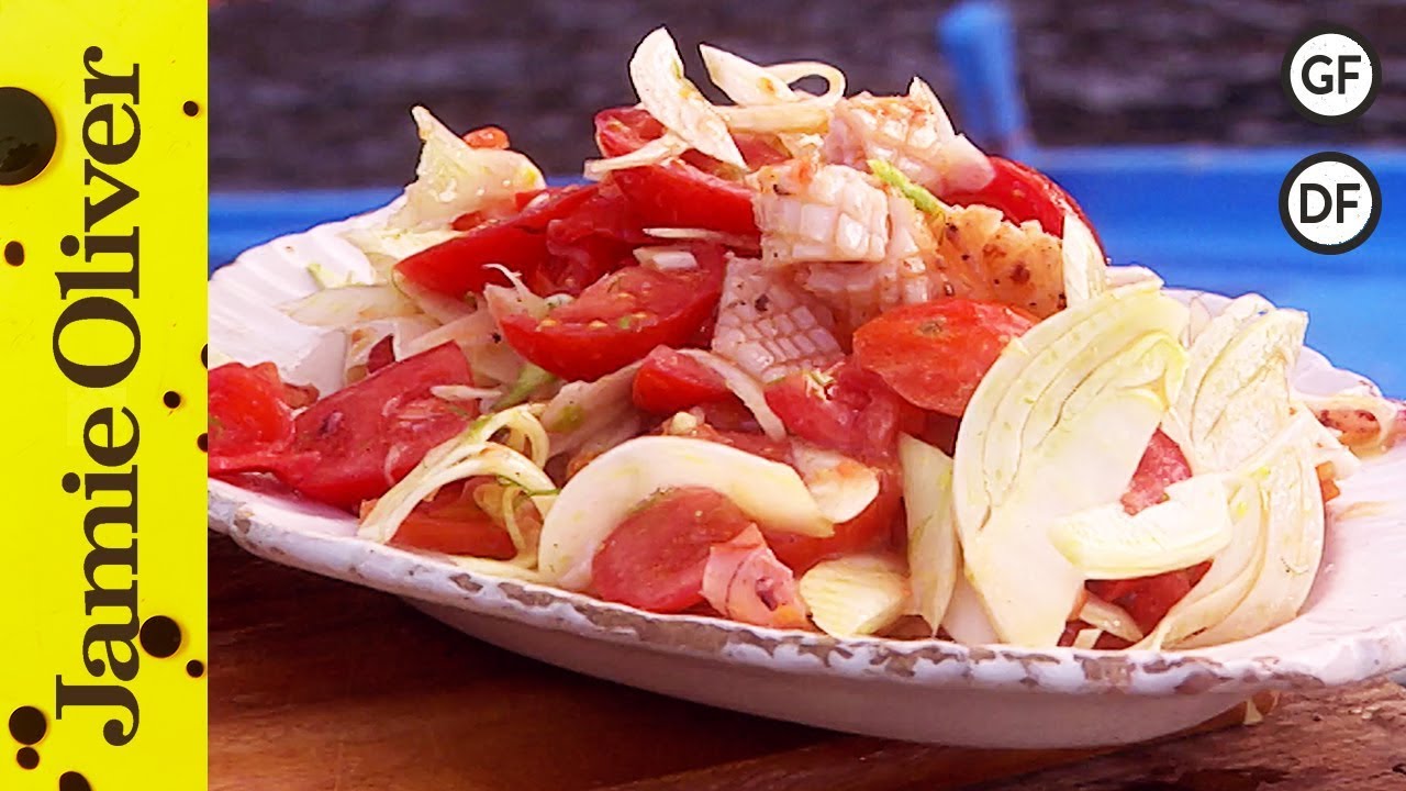 We’re travelling back in time now to when Jamie celebrated his 30th birthday with a road trip through Italy. Here he stops off in Marettimo, an island west of Sicily, to rustle up a beautiful squid salad with chilli, fennel and tomatoes. Fresh, simple and delicious.