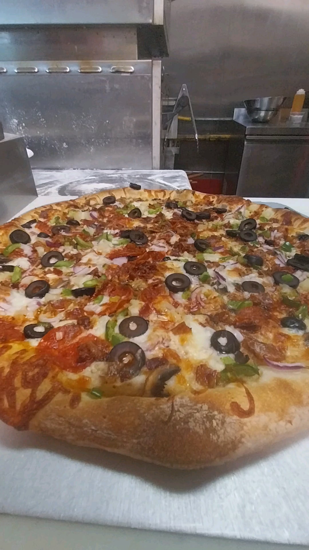 East coast style Neopolitan 14 inch Pizza with "Everything" pulled out the oven, sliced, then slid onto a pizza pan. Pizza looked pretty, and I wanted to share, let me know what you think.