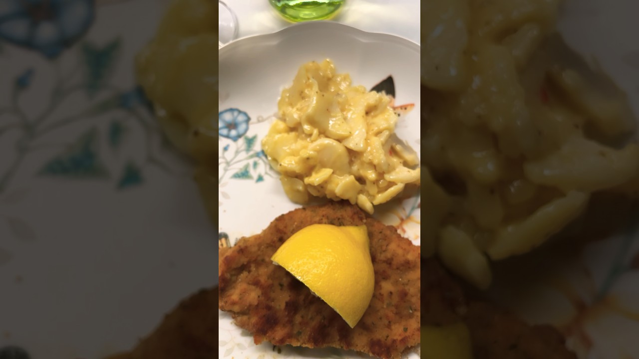 Back in the kitchen tonight with a pork Milanese- schnitzel- with a side of German potato salad and paired with a buttery white chilled Chardonnay wine
