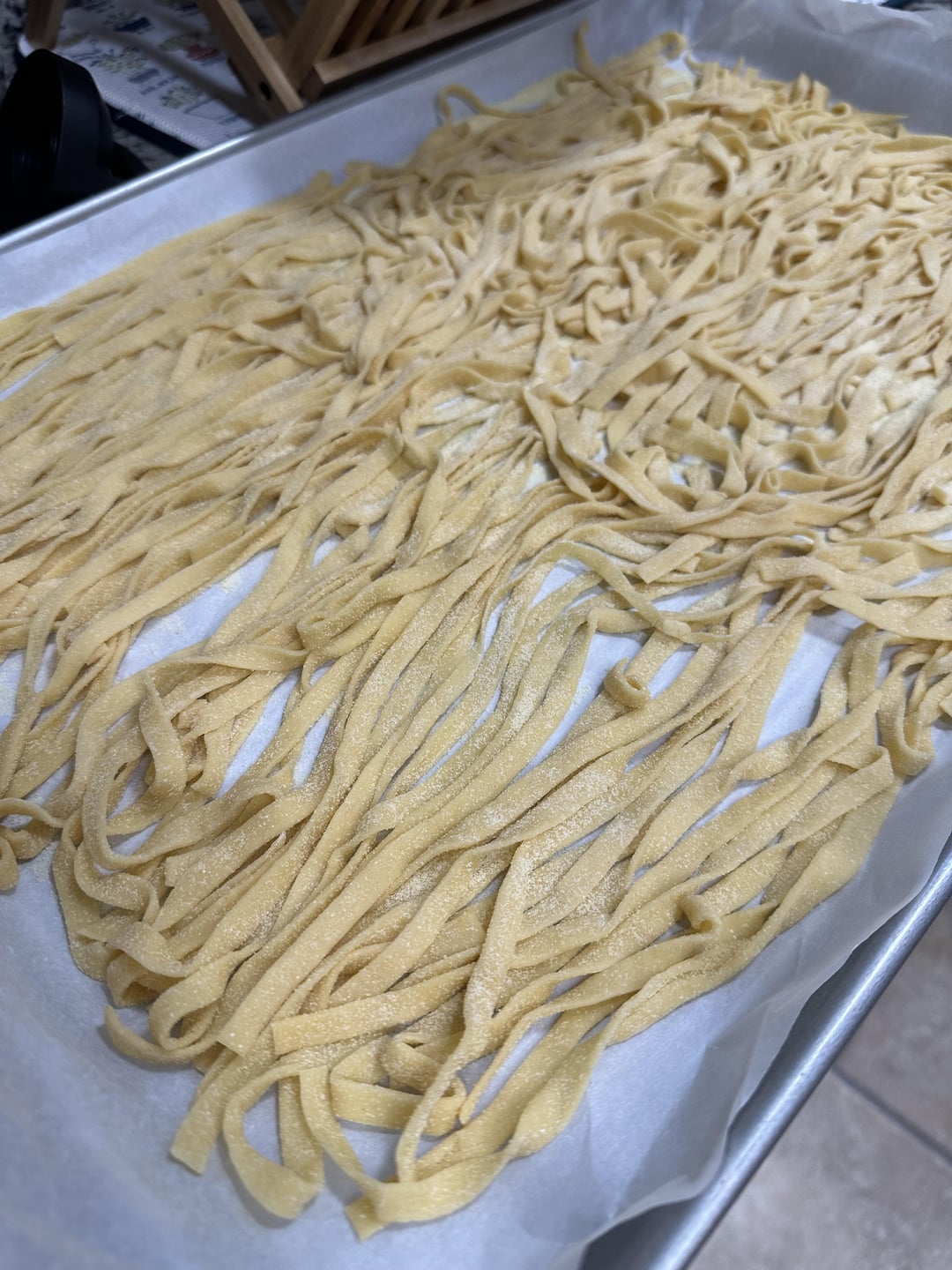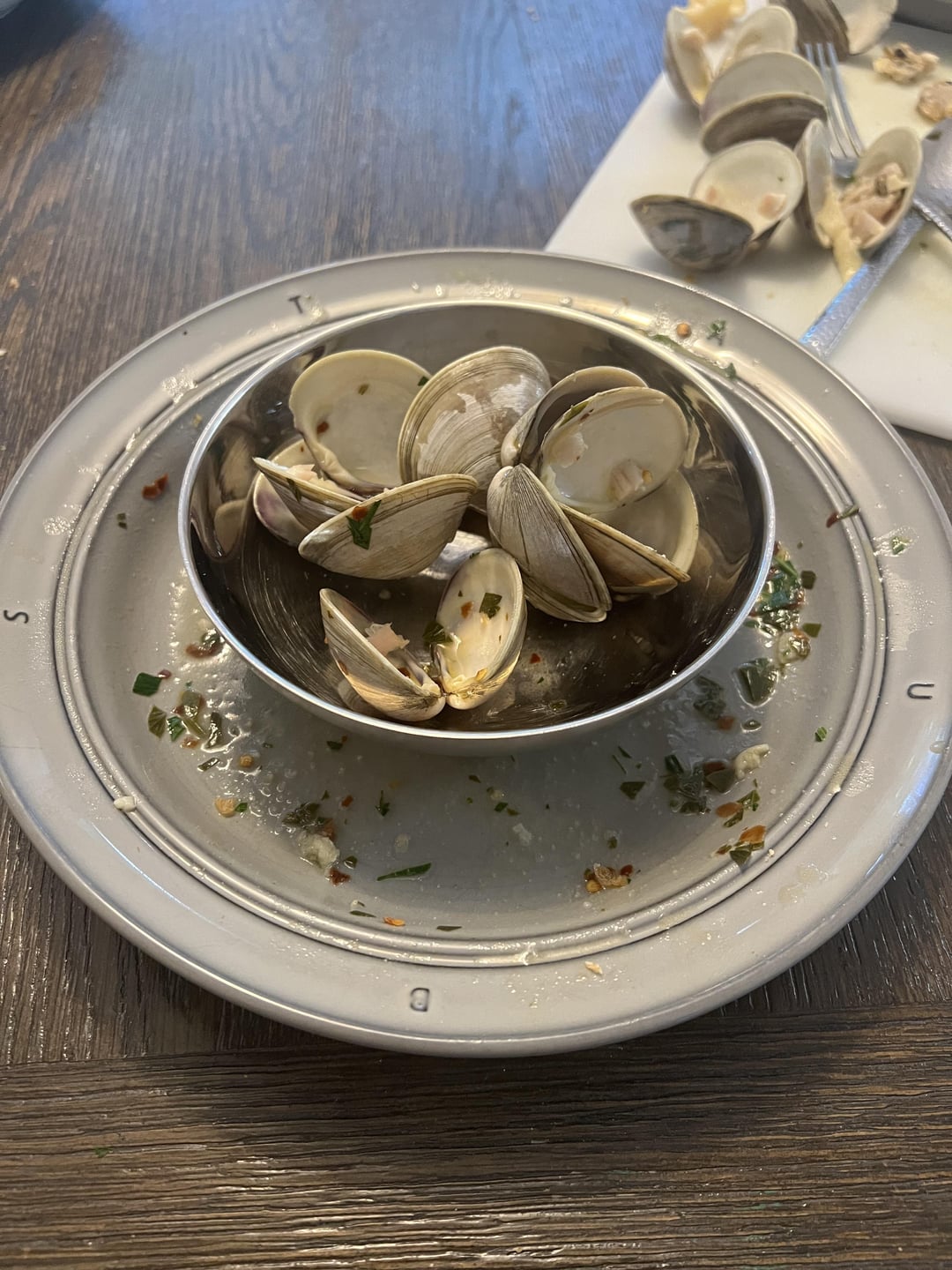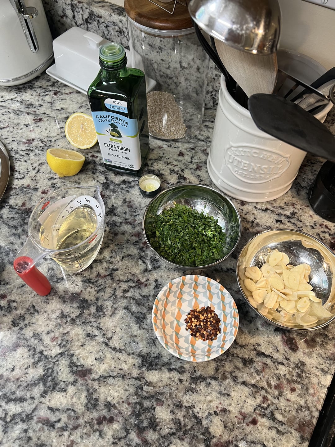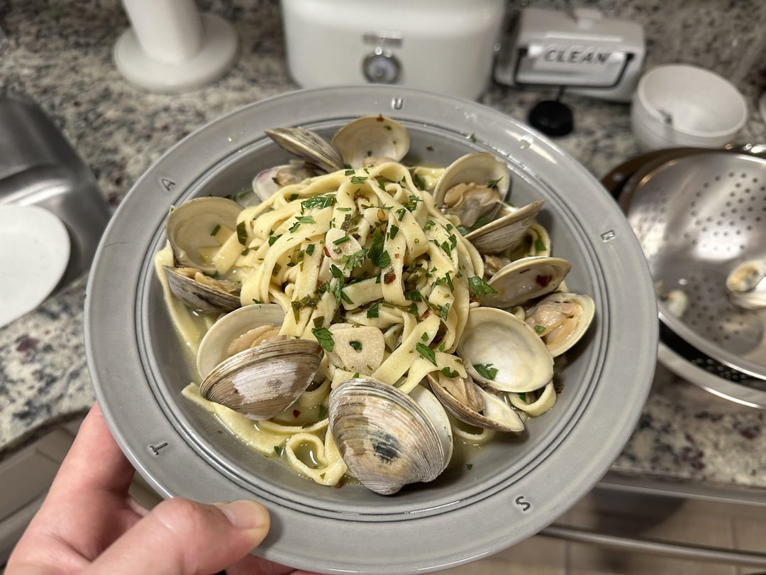 For the sauce: 2lbs littleneck clams, 2 tbsp olive oil, 6 garlic cloves, 1.5 tsp crushed red pepper, 1/2 cup Italian parsley, 1 cup of white wine, juice of 1 lemon, salt to taste.