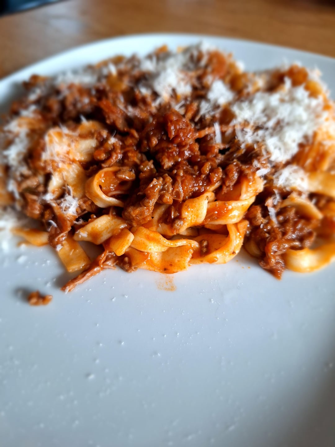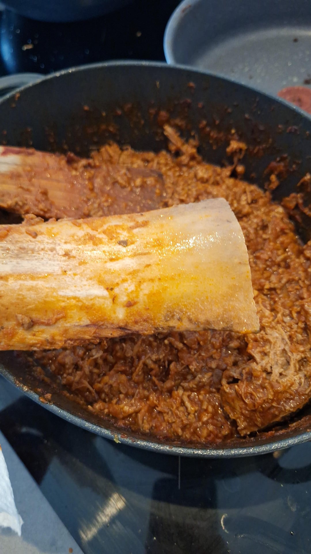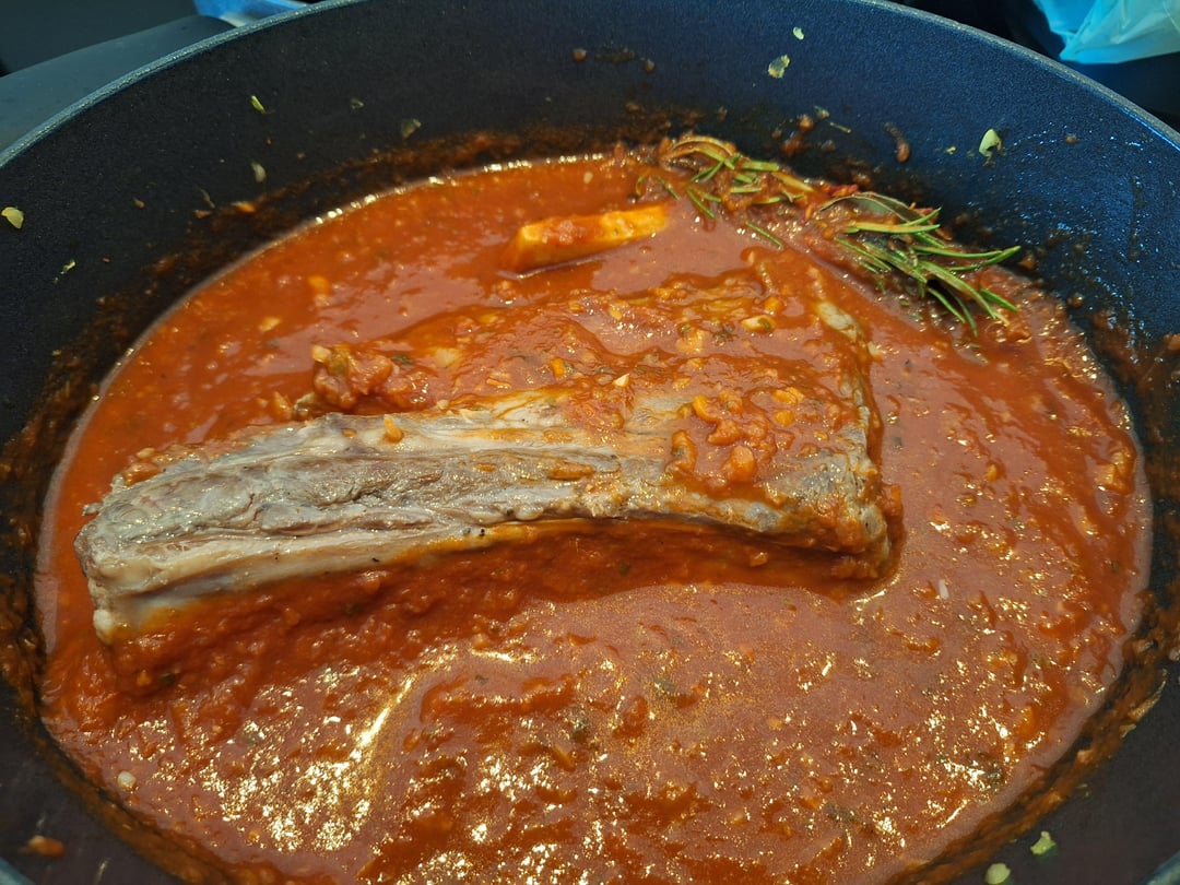 Add the crushed tomatos, beefbroth and your parmesan rind. Combine everything and add your ribs, simmer till the ribs are tender.