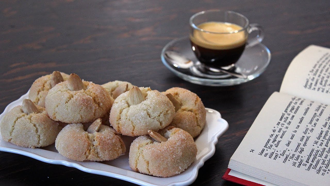 Wet your fingers in some water, scoop the dough and roll into about 14 balls (about 30 g every ball). Roll the balls into white granulated sugar and place on a baking sheet layered with baking paper. Place an almond in the center of every balls and refrigerate for at least 2 hours.