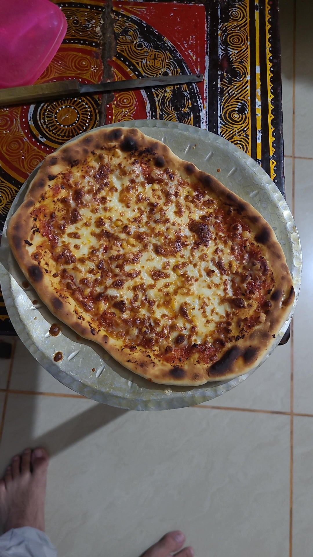 - Stretched the dough added sauce and baked in oven at 200°C until it looked it was half cooked and quickly took it out and added cheese and cooked it again until it looked like image 1