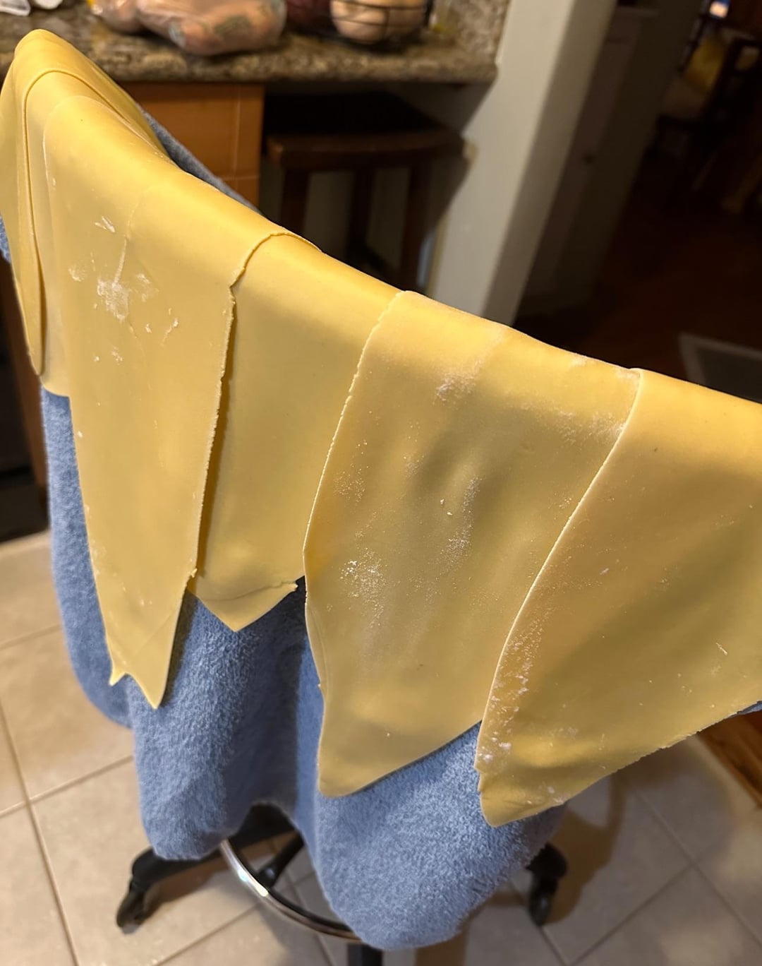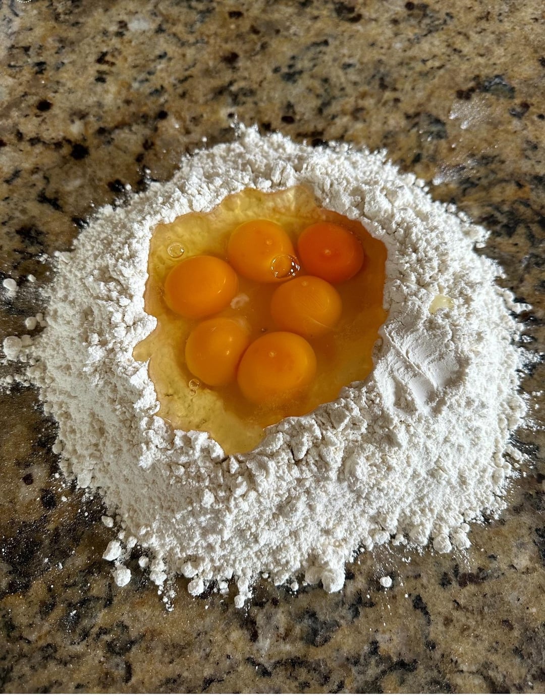 Pasta: 100g of flour per large egg. I had leftover pasta stored in fridge in cling wrap for another dish.