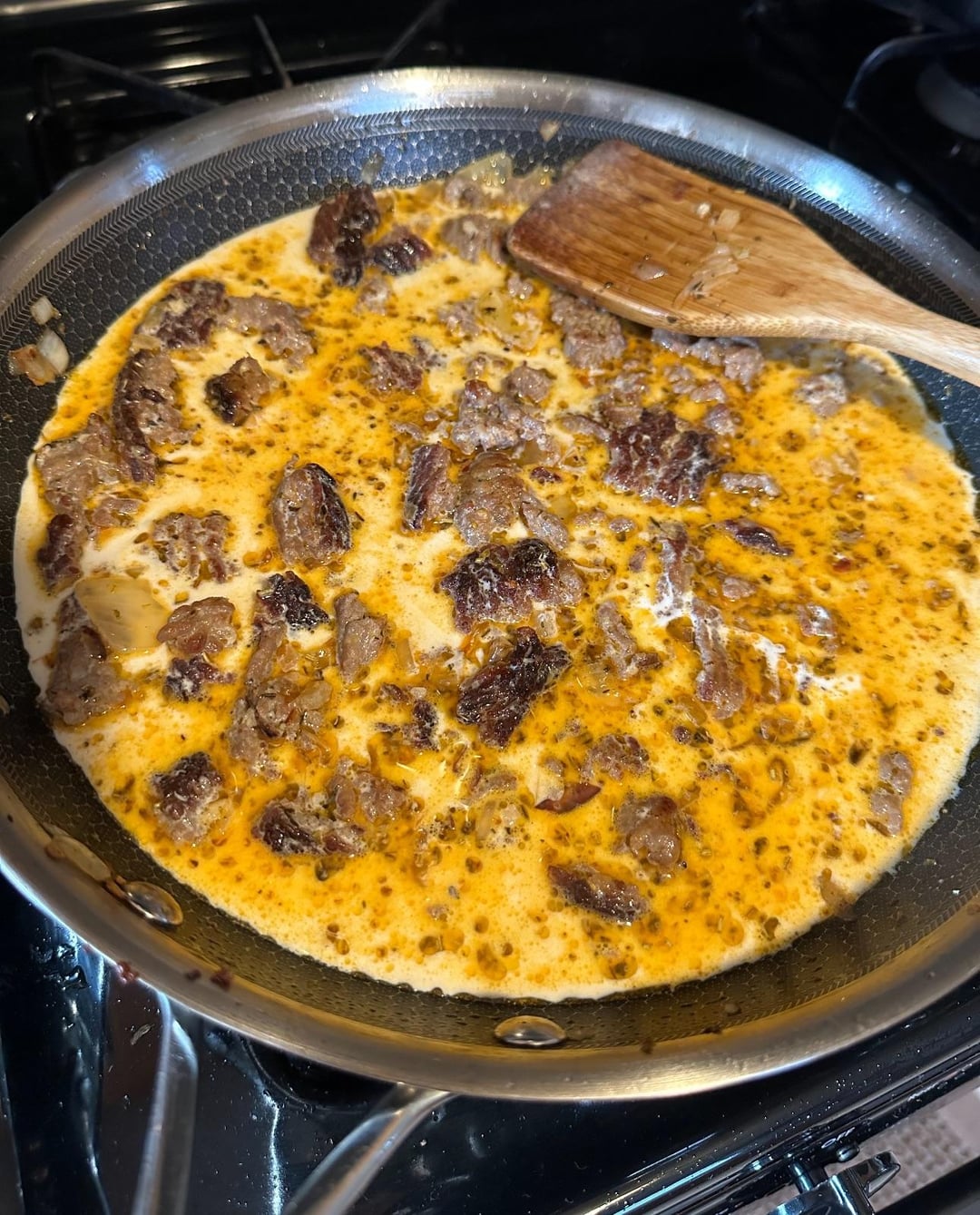 Add the al dente pasta to pan with sauce and sausage, add a couple tablespoons of pasta water, cook for about a minute.