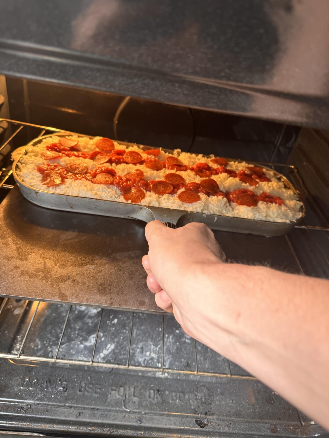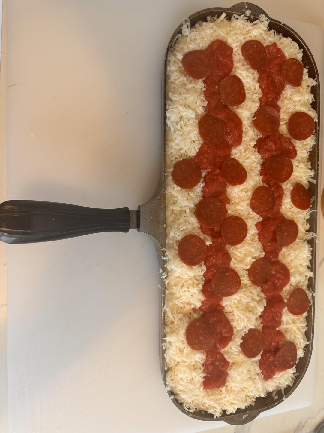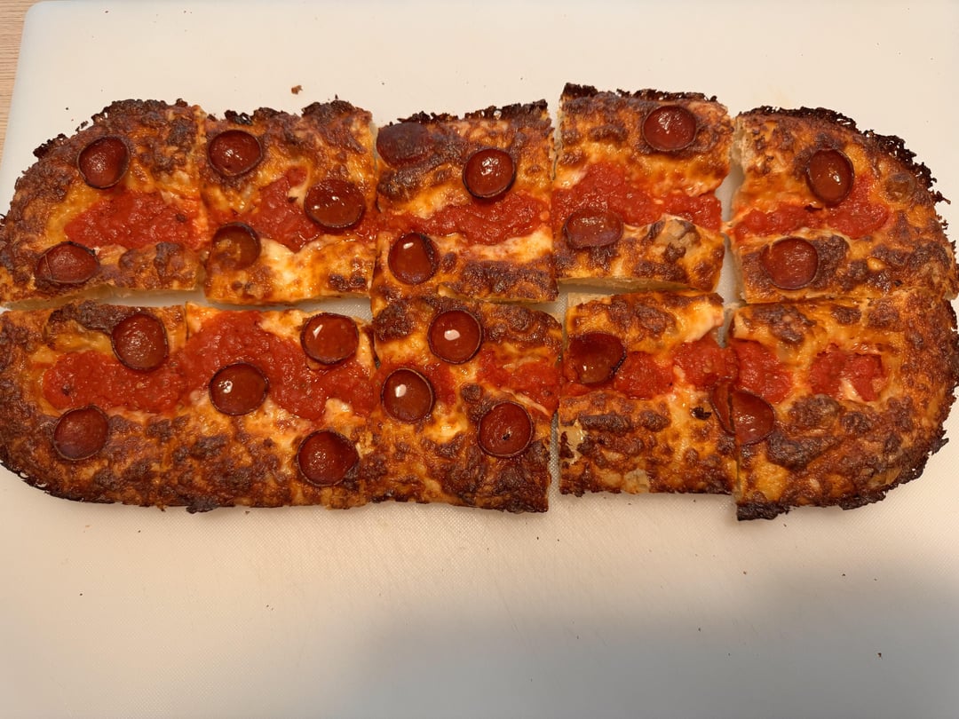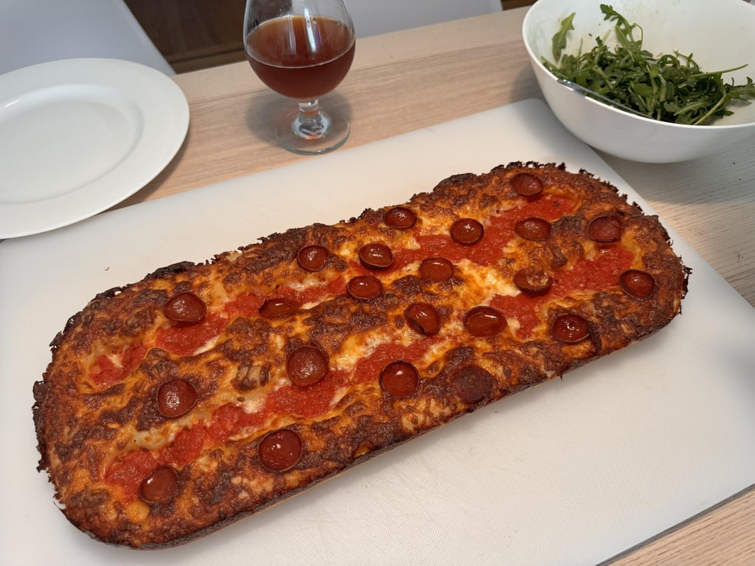 I made some mistakes – I used too much sauce, it was too heavy for the delicate shallower dough, and I ran out of pepperoni.