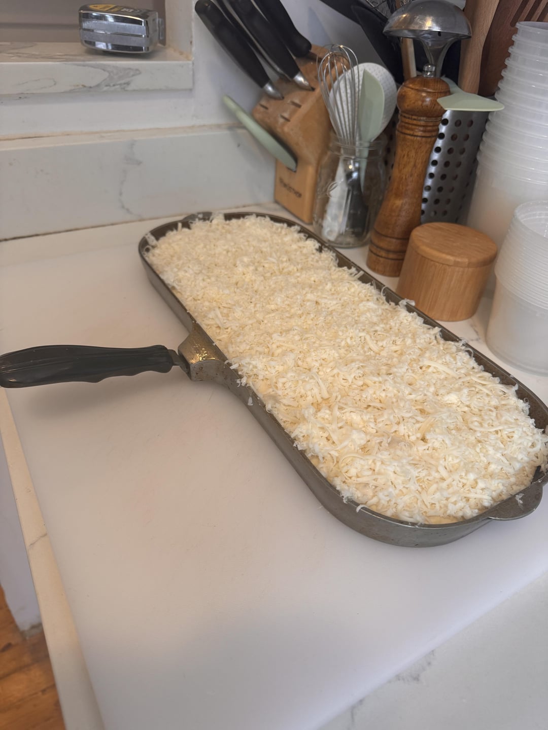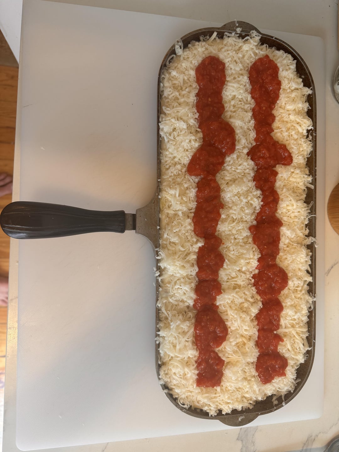 Ok so this pizza is shallow, long and narrow version of Detroit style pizza where the cheese goes to the very edge.