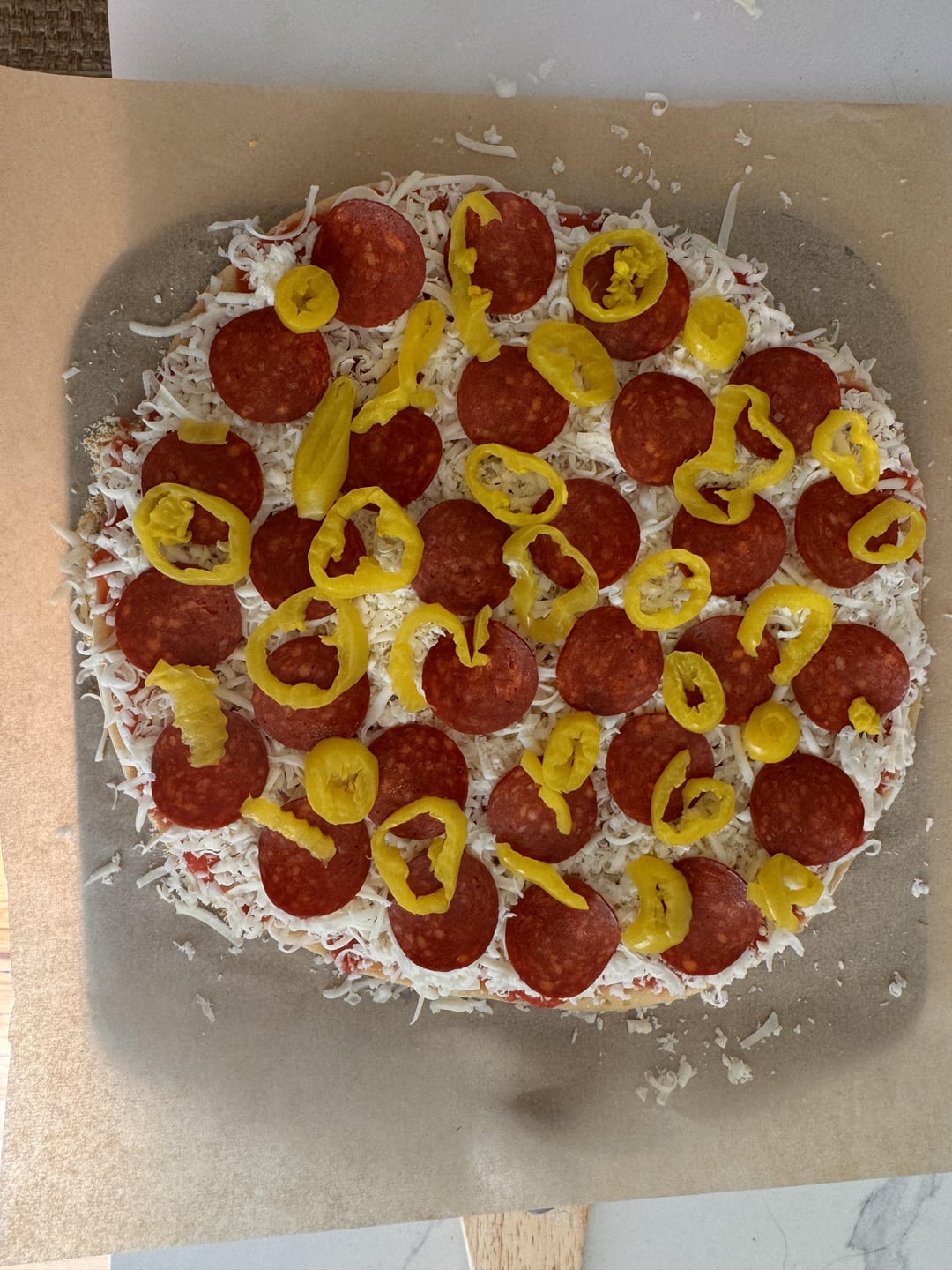 I tried these Whole Foods 365 uncured pepperoni but I’m not super impressed. I just had some banana peppers in the fridge and figured it would make a good combo.